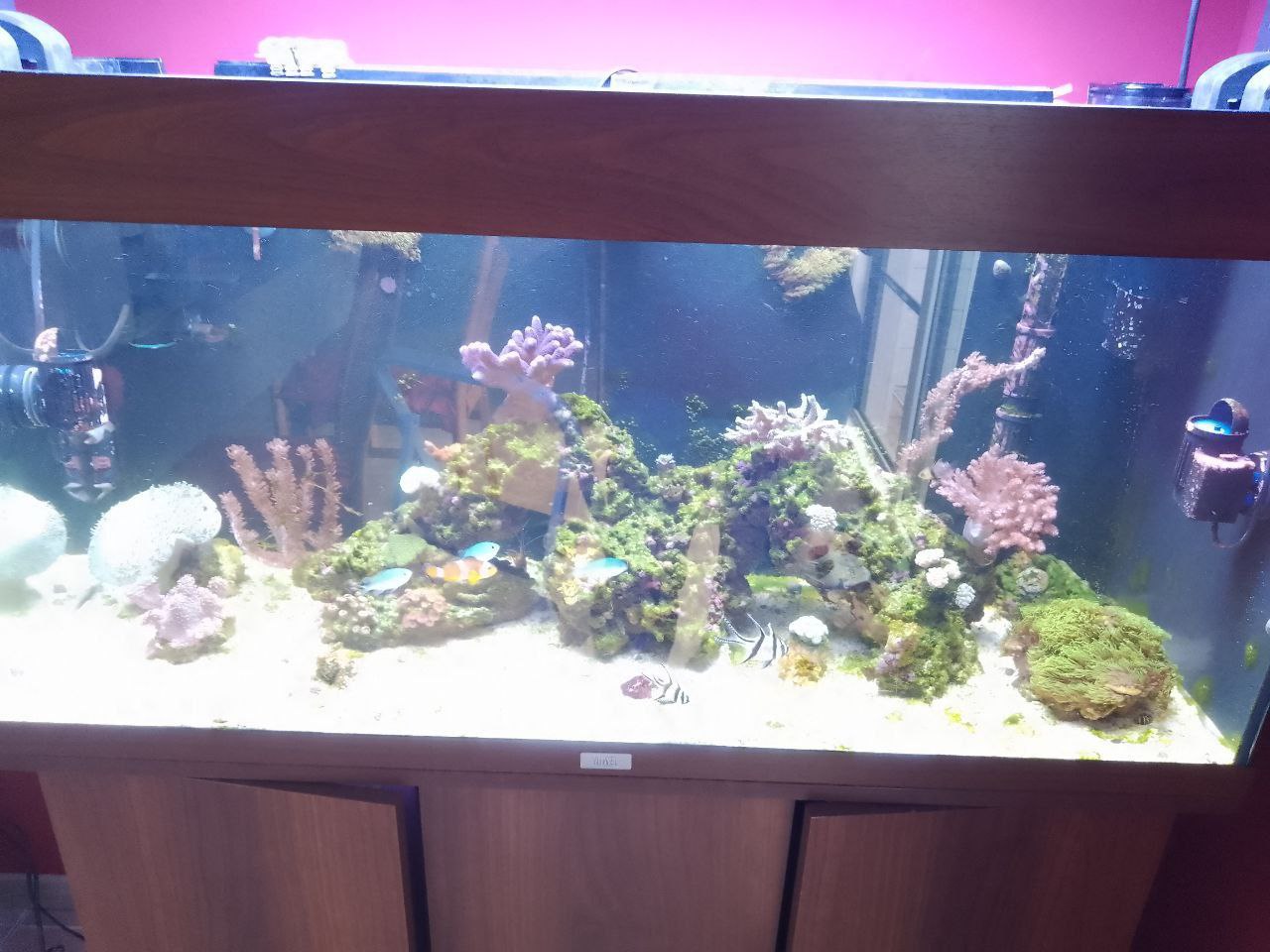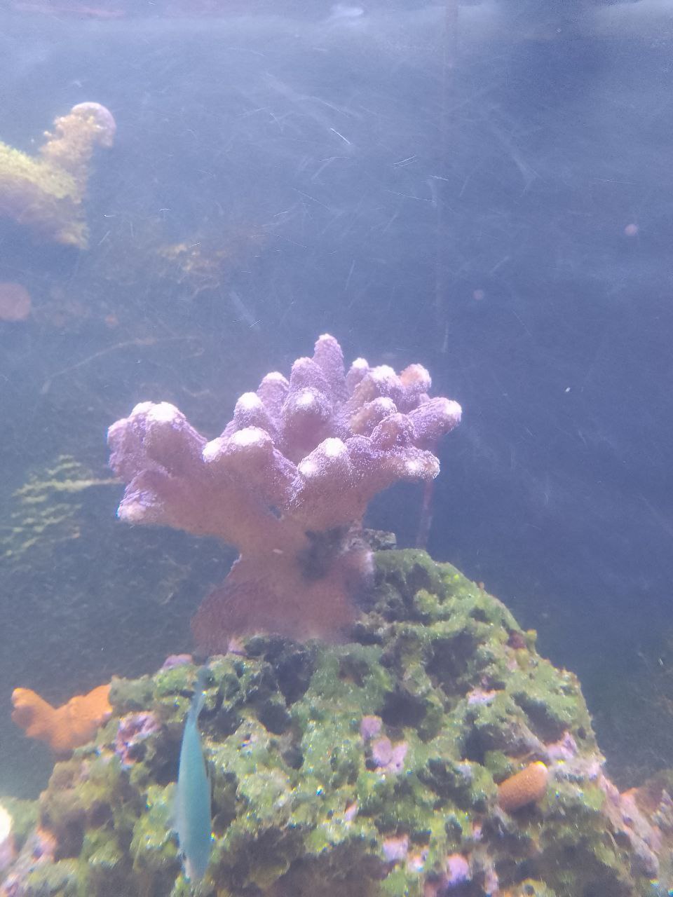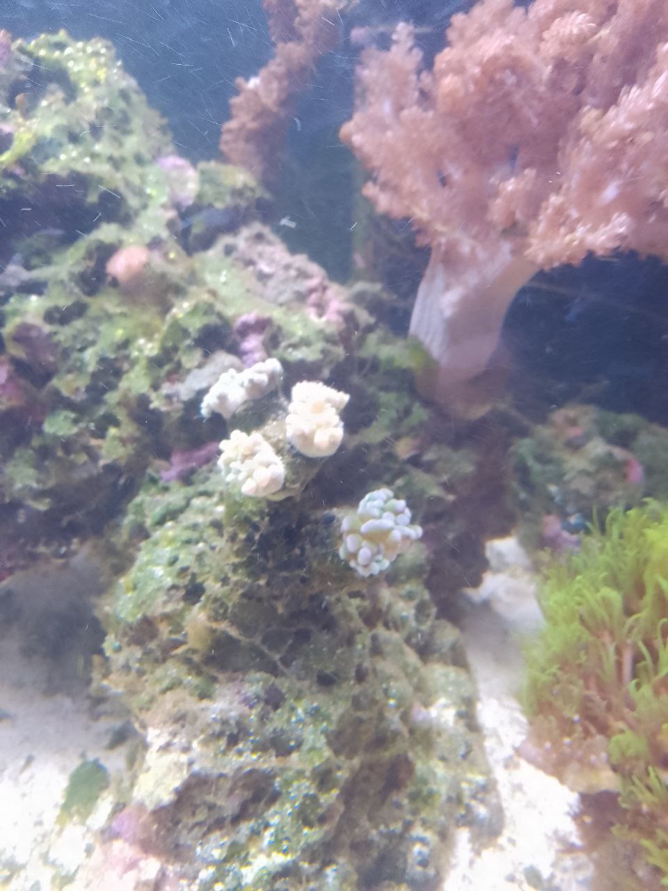 Beim Beckenstart ging mir beim ersten Messen die Spindel kaputt und der Livesand war drin, die Korallen waren auch schon unterwegs. Hatte nur eine schlechte Notfallspindel, die angeblichen 35PSU waren dann doch nur 33PSU laut der neuen Arka Spindel. Aber nun komm's, laut ICP waren es doch nur 33 PSU und nicht 35. Wahrscheinlich hat dadurch die gesamte Biologie oder das was sich bilden wollte, mal so richtig eine geknallt bekommen, weil es nur 31 PSU waren. Ein Stück Lebendgestein kam später, als der Salzgehalt stimmte nochmal dazu. Die ersten 3-4 Monate bestimmten die Algen das aussehen des Beckens und dann kamen die grünen Cyanos. Zwischendurch kurz abgelöst von Dinos, die aber durch zu viel Licht hervor gerufen wurden. Die grünen Cyanos bilden einen recht festen Belag der sich nur schlecht abwedeln oder Absaugen lässt. Die ersten Korallen sterben auch langsam während andere aller bestens da stehen und sogar wachsen.