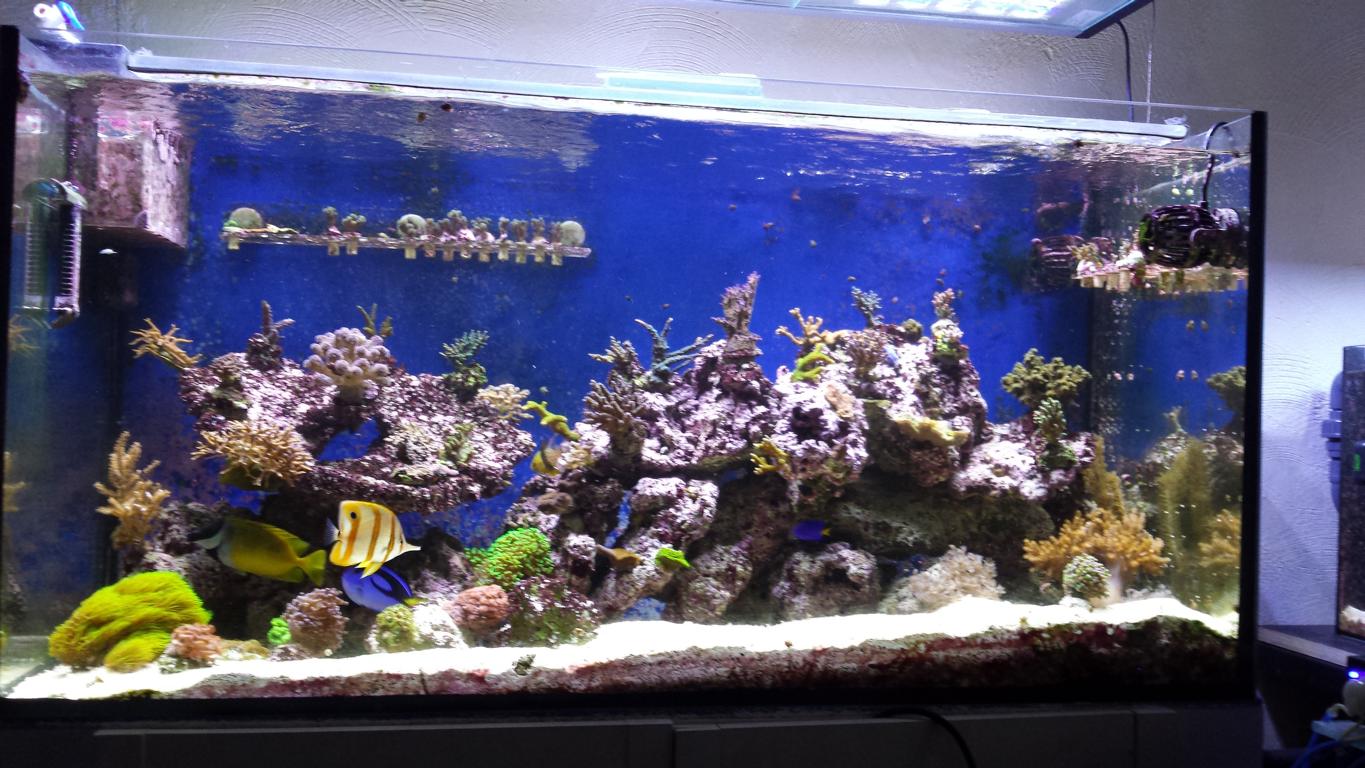 Es hängen mehrere Becken zusammen, Hauptbecken 330l, TB 80l, externes Refugium 50l.