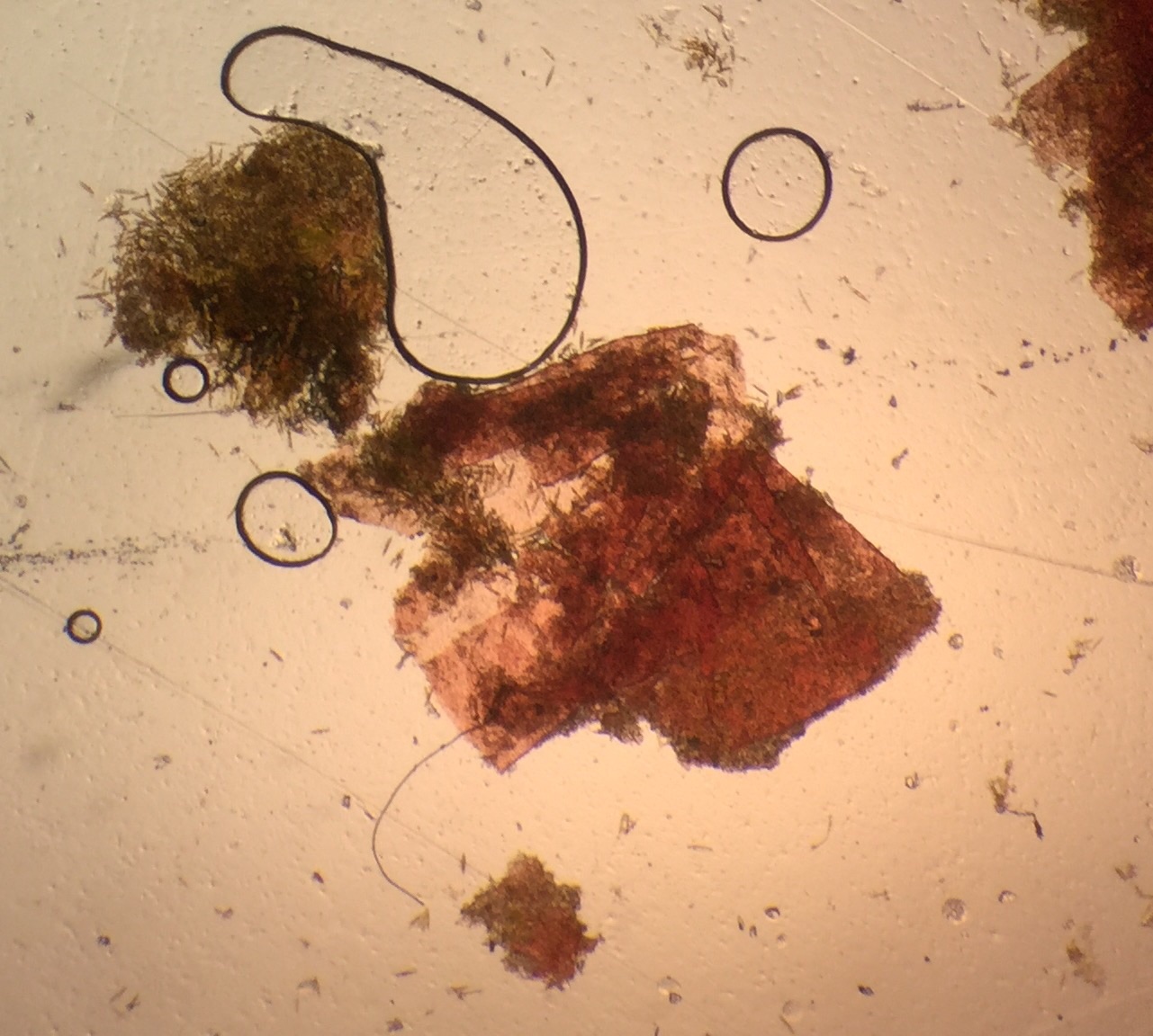 bei dem ersten muss ich auch passen. Die roten Fetzen sind Cyanos. Dann hab ich noch Kieselalgen gesehen.
