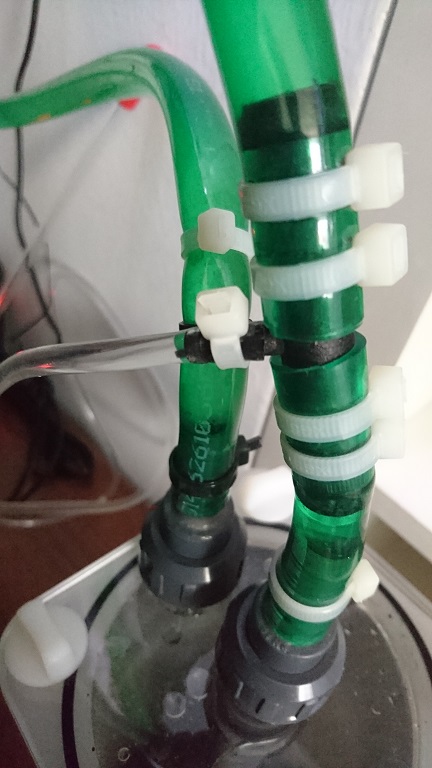 Ich habe beim Eingang ein T-Stück für die Membranpumpe reingegeben. Da habe ich eine eheim dran gehängt wie man sie bei Süßwasser verwendet.