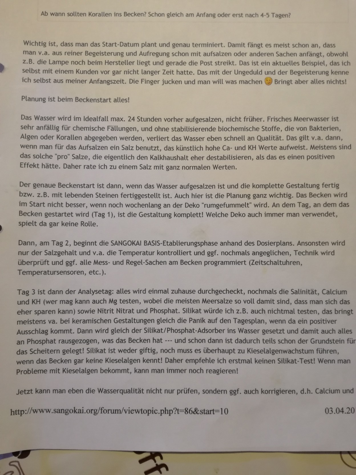 Nächste Woche möchte ich mein neues Becken starten, welches komplett mit Sangokai (Start, Basis, Balance) versorgt werden wird. Jetzt habe ich das Problem, dass auf der Homepage die Anleitung für das Start-System momentan in Bearbeitung ist. Ebenso das Kapitel "Start von Riffaquarien" in den SEA-Z. Ich hätte mir das alles gerne nochmal durchgelesen, bevor es los geht.