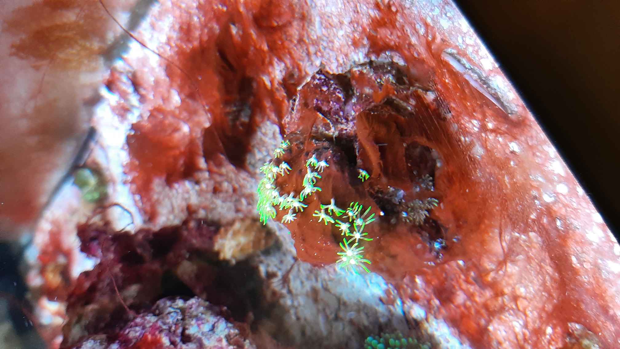 Im 150l Becken blieb der Besatz also erstmal unverändert: neben Schnecken und Einsiedlern leben dort nur 1 Gobiodon okinawae, 1 Eviota pellucida, und 1 Stonogobiops nematodes mit 1 Alpheus randalli. Trotz täglicher Dosierung von Complete und Complex, zusätzlich zu den Basisprodukten, sind wahrscheinlich durch den geringen Besatz die Nährstoffe viel zu niedrig (Nitrat 0 und Phosphat n.n.) - die Folge: innerhalb kürzester Zeit haben sich jetzt massiv rote Cyanos ausgebreitet und befinden sich nun einfach überall!