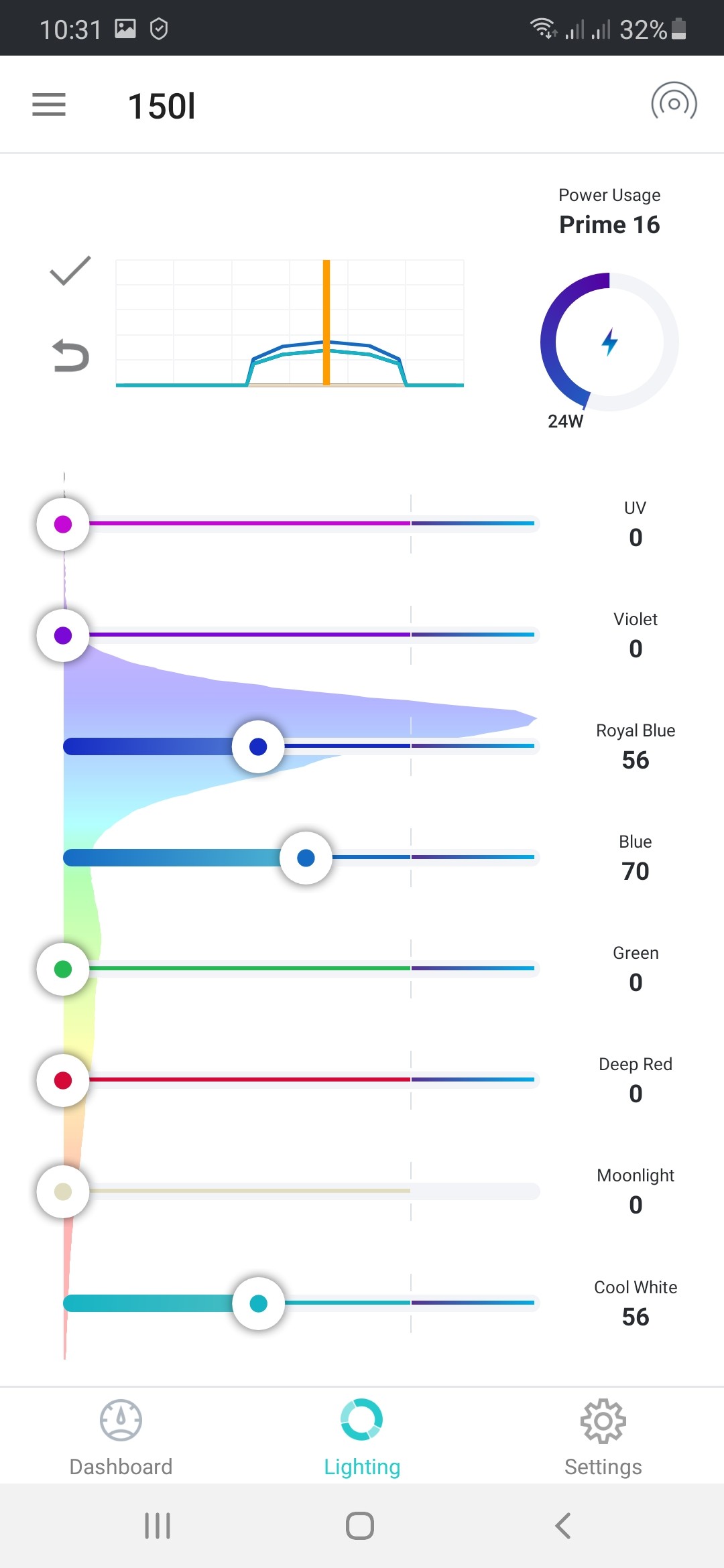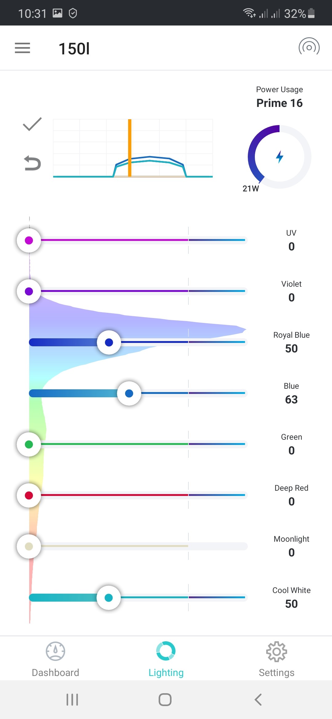 Lampeneinstellung: über dem Becken sind eine Hydra 26 und eine Prime 16 HD, am Anfang waren sie so eingestellt, dass beide zum Tageshöchstpunkt etwa 30 Watt Leistung gebracht haben. Seit etwa 1 Woche, seit die Cyanos komplett aus dem Ruder laufen, habe ich die Gesamtintensität etwas runtergefahren, auf max. 24 Watt (auch weil die SPS an lichtexponierten Stellen zwar Polypen zeigen, diese aber hell werden). Außerdem habe ich rot, grün und violett komplett rausgenommen und den weißen Kanal auf 80% runtergestellt (ist jetzt also gleich hoch eingestellt wie royalblau).