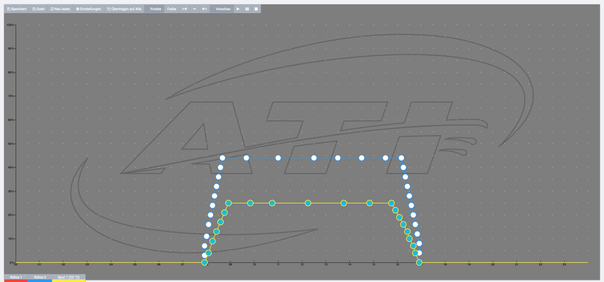 Warum beleuchtest Du dein Becken nur 9 Stunden? Gehe da auf jeden Fall höher. Ich wurde auch die T5 auf 100% fahren. LED Intensität kannst du mal so lassen; eine Glockenkurve bei den LED Einstellungen solltest Du umsetzen.