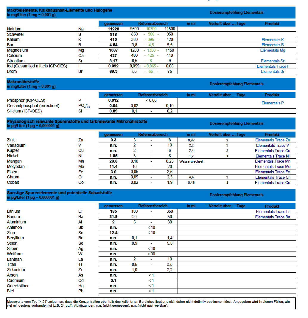 Seltsam sind die hohen Eisen und Mangan Werte, welche normalerweise beim Einsatz von Meersalz entstehen können. Du verwendest aber das Absolute Ocean von ATI. Von dort kann es nicht kommen.