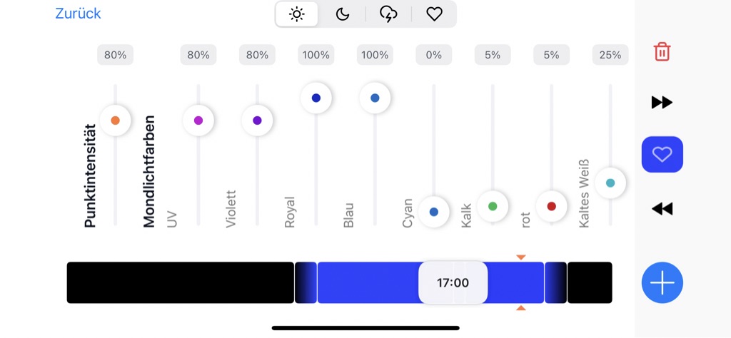 Beleuchtung: Ecotech Radion XR15 G5 Blue mit Diffusor 12 Stunden davon 1 Stunde Sonnenaufang und 1 Sonnenuntergang maximal Leistung 50%