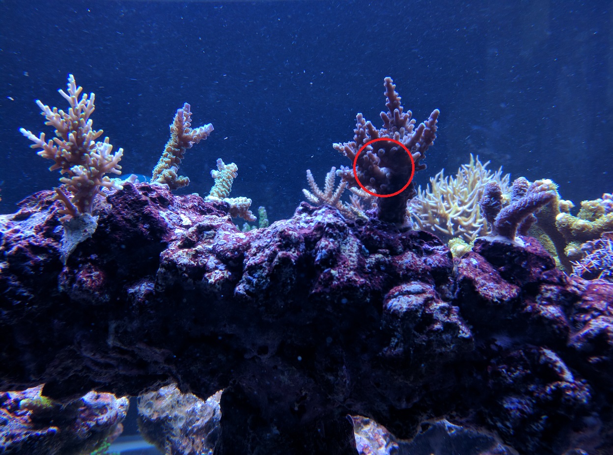 Bei der oberen blauen Acropora würde ich auf einen Gewebeverlust aufgrund von Verbrennung seitens der LED tippen.