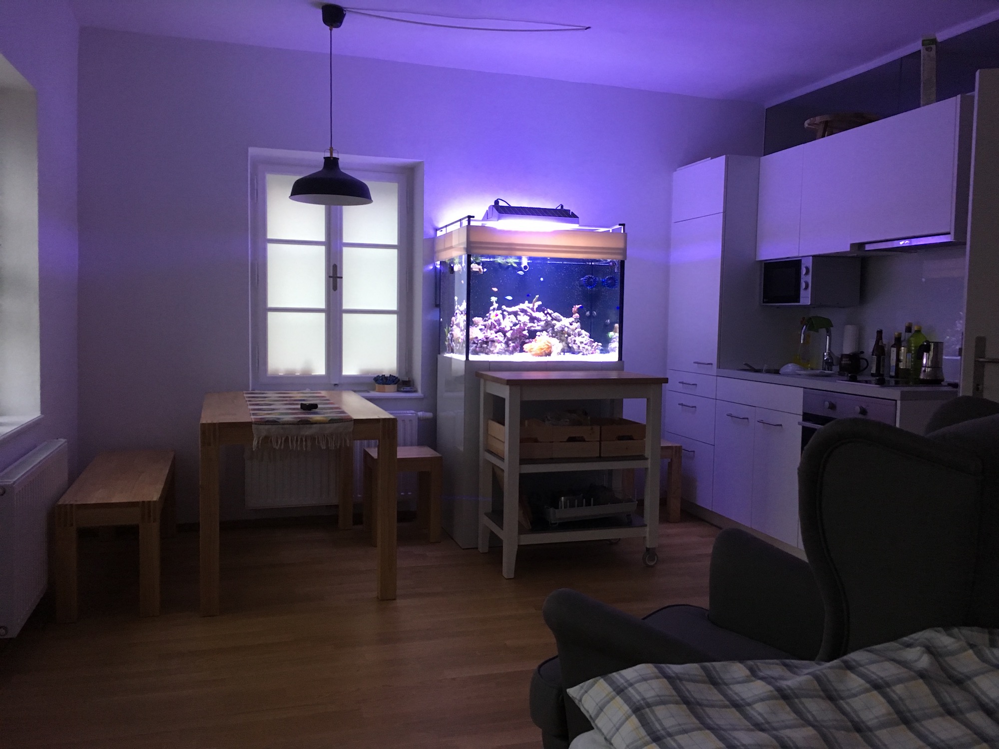 Ich füttere viel, die Chromis sind von oben gesehen richtig in die Breite gegangen. Es gibt täglich einen Mix aus Frostfutter und Plankton Pur. Letzteres wird sehr gut angenommen und dürfte vor allem für die Ferienvertretung ideal sein.