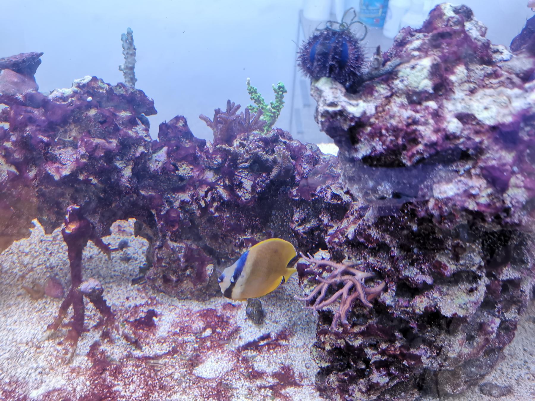 Du hast ein Chaetodon kleinii im Becken. Der ist absolut nicht reefsave, d.h. der frisst SPS Korallen wie verrückt. Der muss raus.