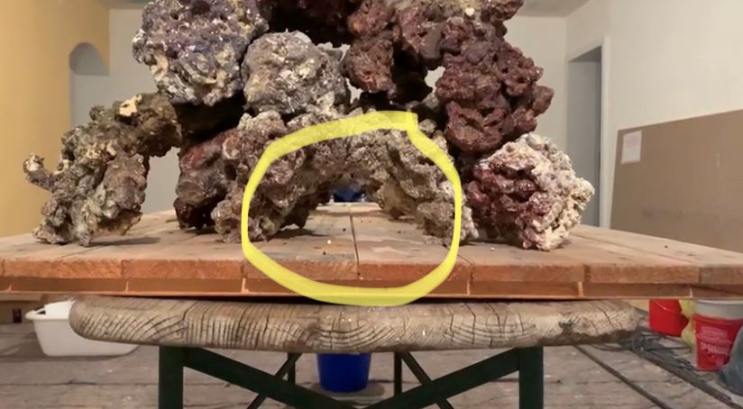Gelber Kreis ist der Bogen im großen "Steinhaufen" der an der Rückwand steht. Durch diesen soll die Mp10 strömen und so gelangt Strömung mitten ins Riff..