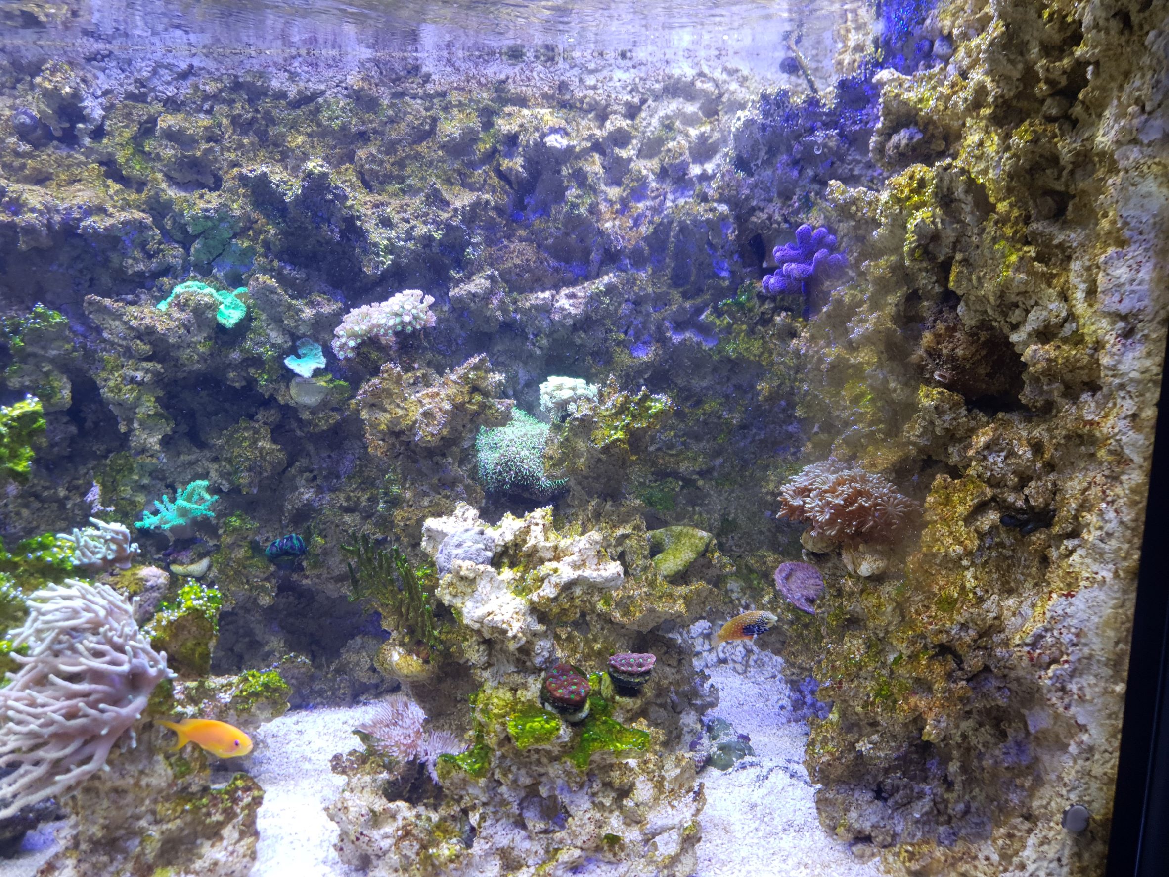 Erst einmal Danke Mirco fürs Einspringen hier und für die Tipps, die auch durchaus gut und richtig sind. Ob man die Säulen entfernt, würde ich aber nicht unbedingt sagen, glaube, dass sieht dann ganz komisch aus. Und ich denke Gido, Dir gefällt die Gestaltung so auch wie sie ist, richtig? Das Becken ist super schwer und auch nicht klein, das kostet ein Vermögen, wenn man ohne Korallenbestand von Null anfängt. Wenn Du so viel Gestaltung wolltest, musst Du das auch alles besetzen, und klar, die Korallen dafür sind nicht günstig. Die dürfen natürlich Platz zum wachsen haben, aber bis dahin wird Dir alles mögliche wachsen, leider. Das muss man aushalten. Schau mal, ob Du z.B. normale Tectus Schnecken bekommst, die mit Kalkrotalgen bewachsen sind, so hab ich mir meine z.B. eingeschleppt, und die Schnecken wandern durchs ganze Becken und man könnte meine, die verteilen die Kalkrotalgen so auch. Um Kalkrotalgenwachstum zu bekommen, braucht man Kalkrotalgen, die muss man mittlerweile einbringen, während sie früher mit Lebendgestein ein gekommen sind. Schnecken aus dem Handel die importiert sind, sind meistens clean. Schau also mal bei privat, vielleicht hast Du jemanden in der Nähe, der Dir „Kalkrotalgenträger“ abgeben kann.