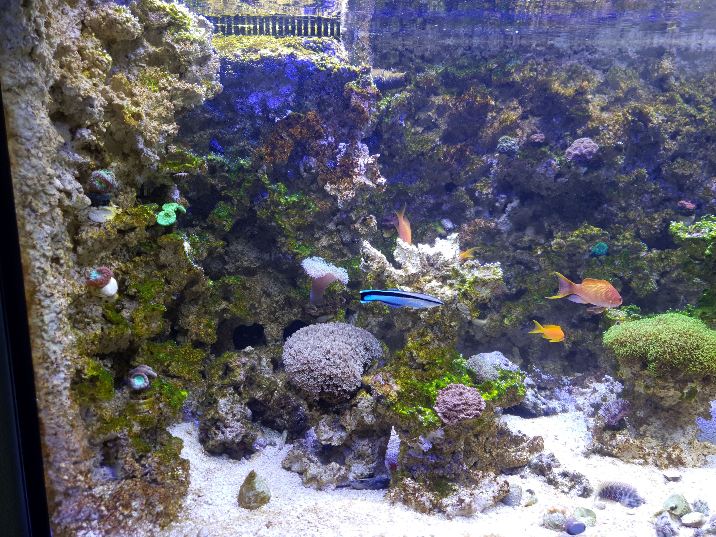 nun habe ich doch einige Korallen eingekauft. Insgesamt sind nun 22 unterschiedliche die Meinen. Auch sind einige Fische mit dazu gekommen. 6 Fahnenbarsche, zwei Grundeln, zwei grabende Seesterne, ein Algenblenny. Außerdem habe ich mit dem BASIS System angefangen zu dosieren. Ich habe gemerkt: je mehr ich das BASIS System dosiere, je mehr wachsen Fadenalgen. Zufall oder nicht? Ich weiß es nicht und habe die Dosierung so gelassen wie nach Dosierplan für die erste Woche.