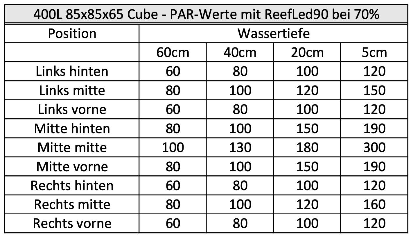 Des Weiteren habe ich am Samstag einen Wasserwechsel von 20 % durchgeführt und die Beleuchtung der ReefLed 90 angepasst, wie in Sangokai A-Z empfohlen. Aktuell laufen die Lampen auf 70 %, diese lasse ich jetzt langsam über 99 Tage bis 100 % erhöhen. Im gleichen Zuge habe ich der Einstellung die PAR Werte gemessen, ich habe eine Tabelle der gemessenen Werte bei 70 % angehängt. Ich werde im nächsten Jahr die Lampe auch nochmal austauschen, da diese grade in den Ecken doch etwas wenig Licht bietet.