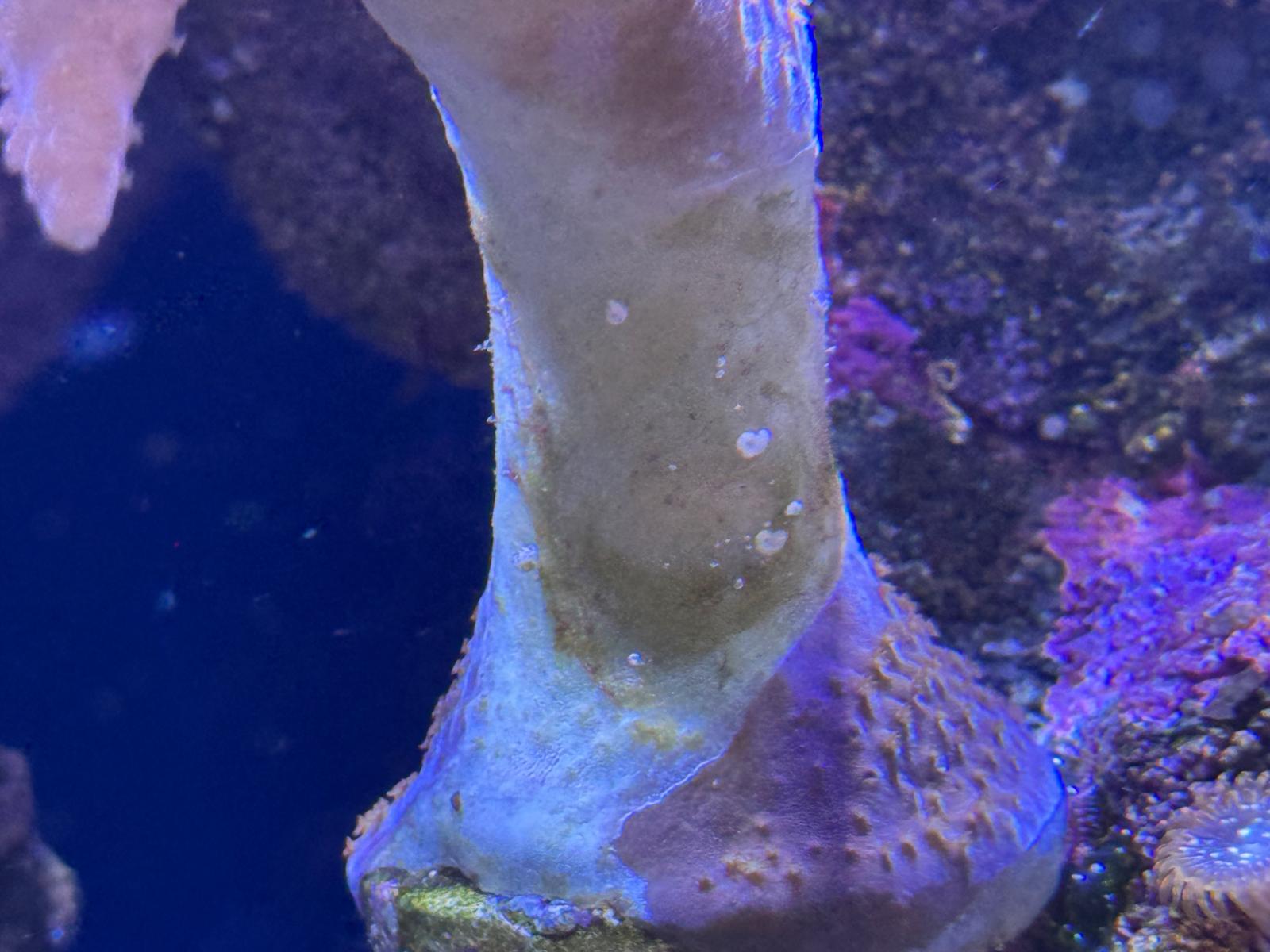 Dann mit der flach wachsenden auf dem Stein unten rechts, die war mal knall Rosa mit blauen Polypen, sie ist total verblasst.