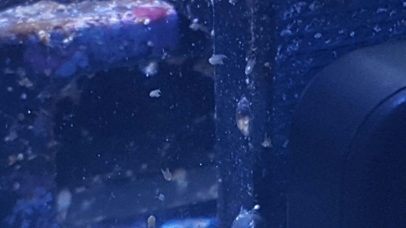 Momentan sind nur einige an der Scheibe zu sehen und teilweise auf den Cyanos habe ich auch schon welche entdeckt. Auf den Korallen scheinen sie sich nicht aufzuhalten, habe jedenfalls noch nichts entdecken können. Die grössten sind vielleicht 2mm gross, grössere konnte ich auch noch nicht entdecken. Evtl. werden die die grösseren von meinen Fischen gefressen.