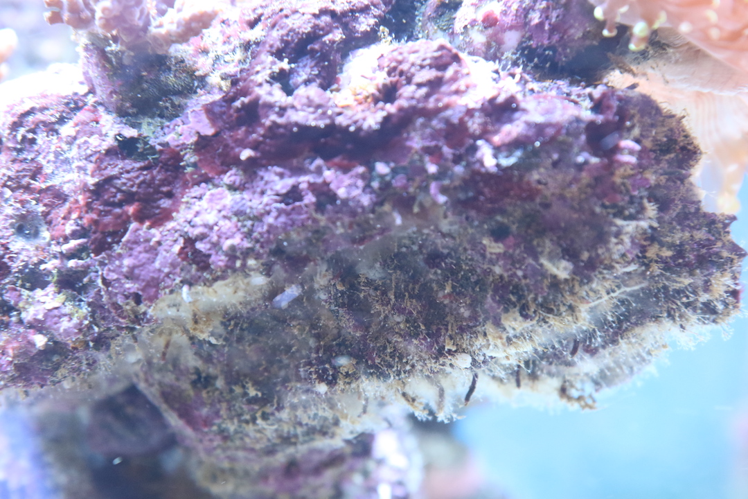 Einen Rückschlag und viel Chaos gab es nach meinem erfolglosen Einsatz von "Fluconazol" (oder was auch immer ich für ein weisses Pulver bekommen habe) gegen die Bryopsis. Viele Acroporen haben sich erholt, manche allerdings sind noch komplett farblos oder zeigen Gewebeverlust (welcher teilweise schon repariert wird). Leider haben manche Bryopsis-Nester überlebt und ein neuer Versuch echtes "Fluconazol" muss ich wohl bald starten. Leider frisst sie der Seehase nicht (dafür laicht er aber alle 3 Wochen)...