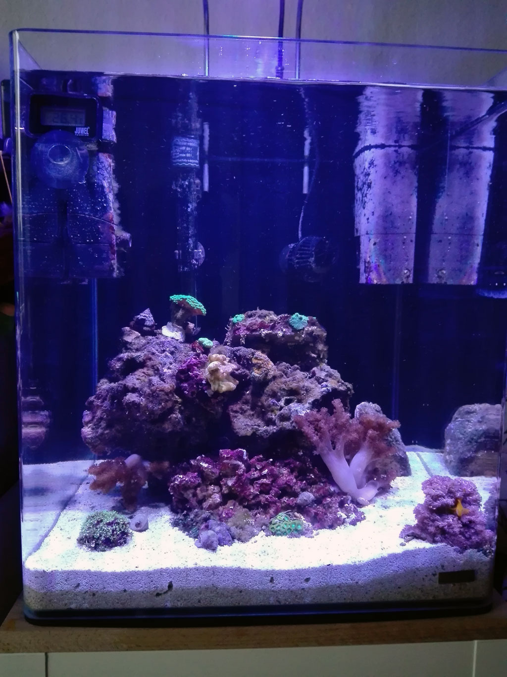 Der Cube wurde mit neuen und "eingefahrenem" Gestein aufgebaut, dazu angedampfter neuer Bodengrund und 2/3 zu 1/3 Salzwasser vom kleinen Becken übernommen.