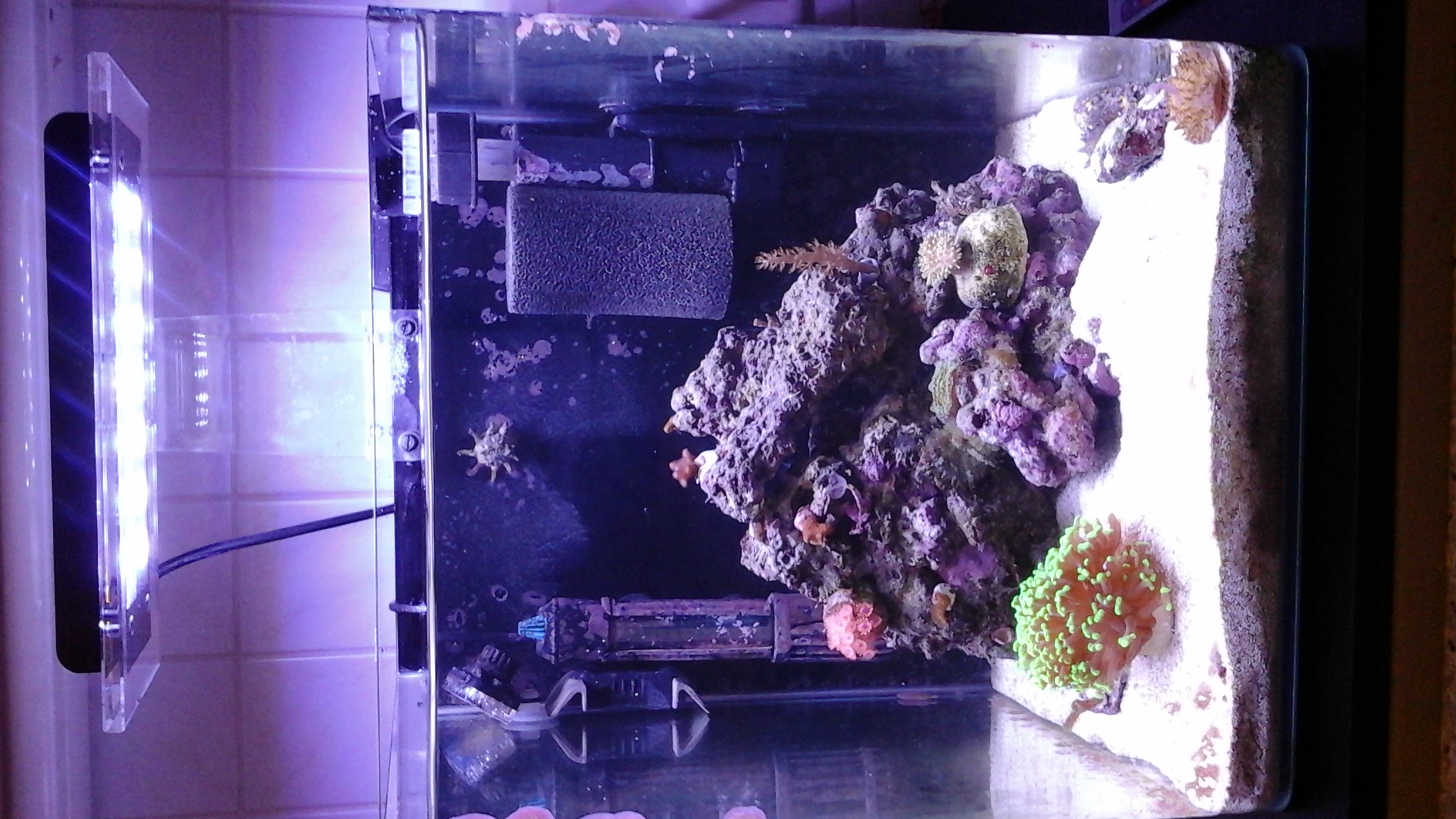 Besatz: 3 tectus, 1 knallkrebs mit partnergrundel, mehrere kleine Röhrenwürmer vom Lebendgestein, 4 mini-sps ableger vom grossen becken, 1 ableger sacrophyton, 4 krusten, 2 ricordea florida, 1 fungia