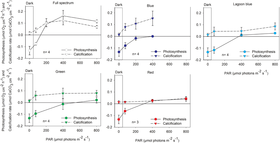 Das Bild zeigt die Kalzifikations-und Photosyntheseraten bei der Koralle Acropora variabilis unter unterschiedlichen PAR-Werten in Abhängigkeit zu den Lichtfarben (blue, lagoon blue, green und red).