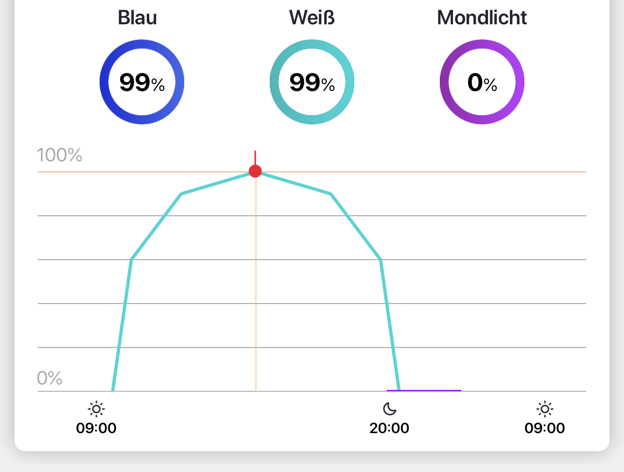 Wo liegt nun das Problem: bereits bei geringen Wattstärken/ oder wenn man will geringen % Einstellungen ist die Strahlung für das kleine Becken enorm. Ich musste lernen, auf UV und Violett ganz zu verzichten und neben den beiden Blautönen nur die beiden weißen LED einzusetzen. Rot und grün nehme ich nur zur Farbverbesserung bei 5% maximal. Indigoblau bei 80%, blau bei 100%, weiß bei 100%. Begonnen habe ich bei 65% Gesamtintensität und das war der Fehler. Ich würde heute bei 20% beginnen und jede Woche um 5% steigern. In einem so kleinen Becken kann man Korallen nicht "tief" positionieren, um sie anzupassen und dann später höher zu setzen. Daher ist auch das spätere Nachsetzen von Korallen nicht unproblematisch. Denn wenn man die Korallen gewöhnt hat und ggf. auch UV und Violett verwendet, besteht für jede neue Koralle wieder Verbrennungsgefahr.