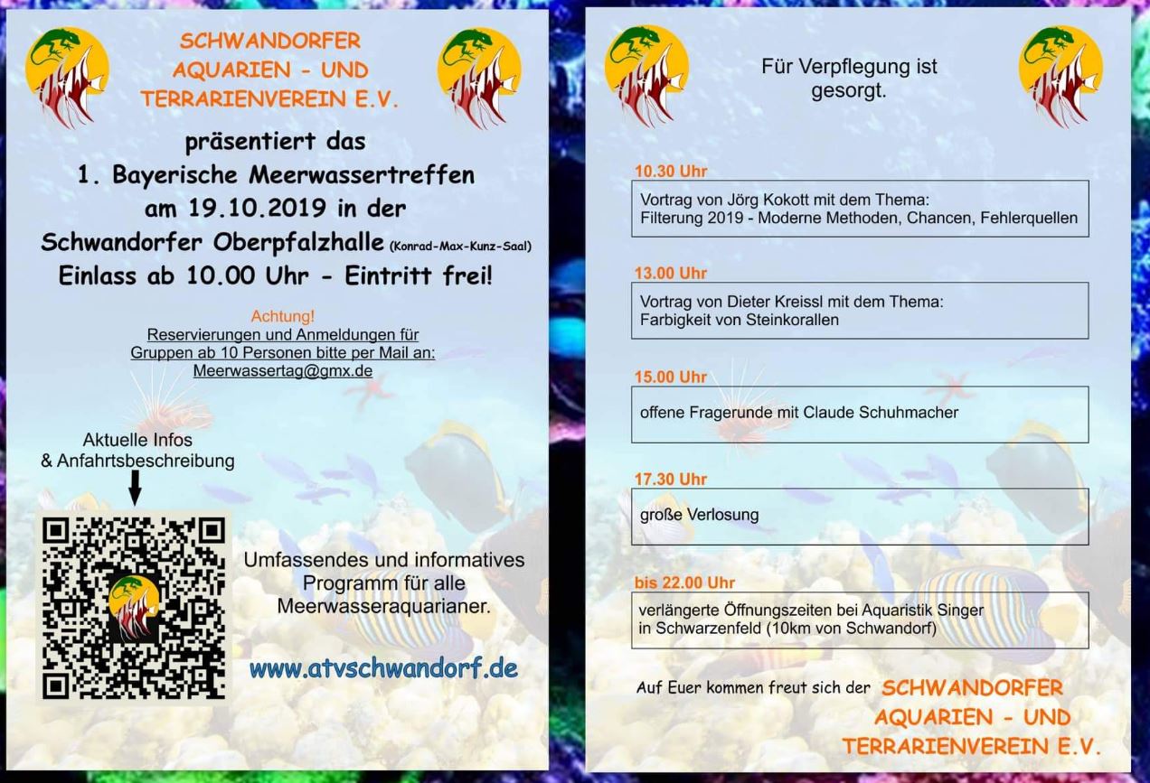 Ein Tag von und für Meerwasseraquarianer und solche die es werden wollen. Wir bieten die Möglichkeit eines bayernweiten Treffens mit tollem Rahmenprogramm. Wir haben drei hochkarätige Referenten gewinnen können und dank der zahlreichen Sponsoren gibt es eine Verlosung mit richtig tollen Preisen. Ein ganzer Tag mit umfassenden Programm und der Möglichkeit, sich untereinander mal persönlich kennen zu lernen! Zudem öffnet Aquaristik Singer für uns die Pforten des Ladens am Veranstaltungstag bis 22.00Uhr, so dass auch weitgereiste die Gelegenheit nutzen können sich umzusehen!