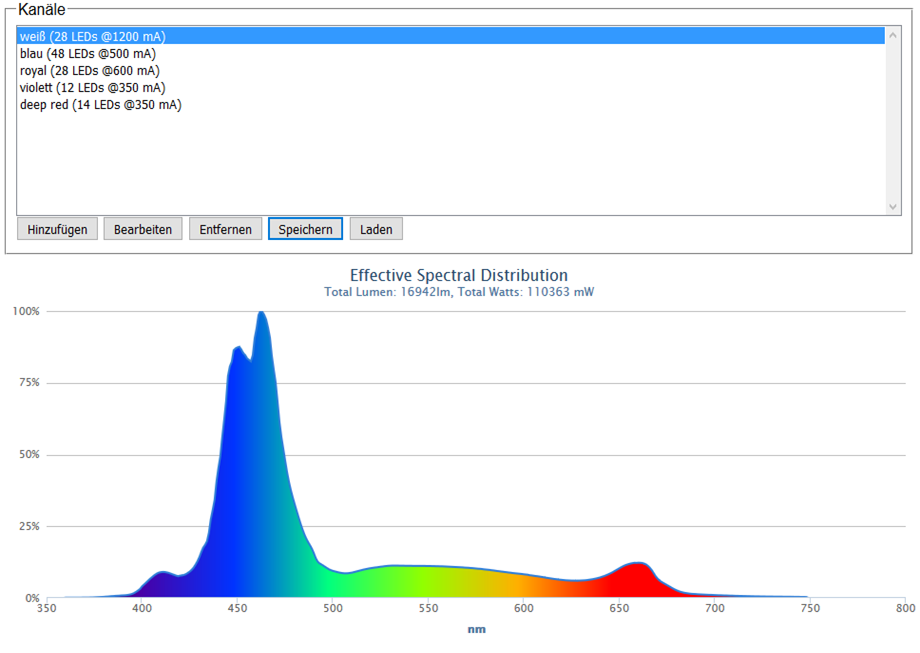 Nachdem die Anzahl der LEDs klar war, habe ich mir noch das zu erwartende Spektrum plotten lassen.