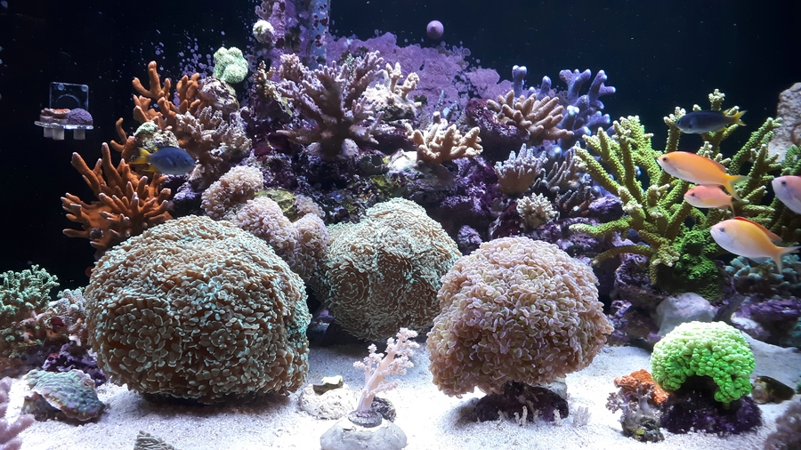 Das Becken ist gut besetzt mit Steinkorallen (SPS/LPS wenige LPS)) bei niedrigem Fischbesatz und üppigem Korellenbesatz.