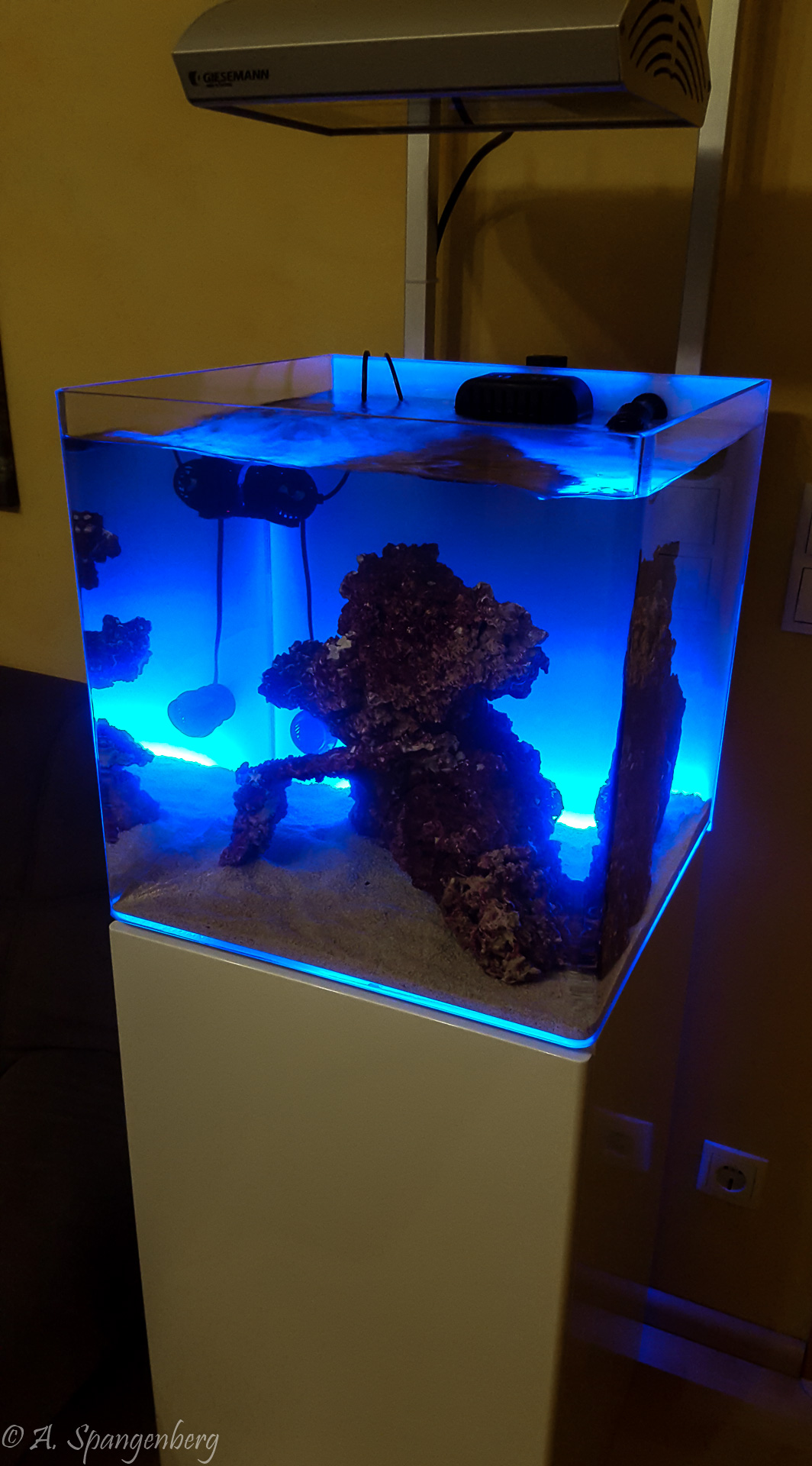 Ansonsten wird sich Dein Becken sicherlich gut entwickeln. Schaut gut aus. Wirklich sehr hübscher Aufbau. Ich würde Dir dazu raten, dass Du das Wasser frühzeitig mal mit einer Fauna Marin economy Analyse checken lässt, damit Du Mangelsituationen, die sich z.B. direkt aus dem Meersalz ergeben, frühzeitig entdecken kannst (Kalium-, Bor- und Iodmangel sind hier häufige Probleme).