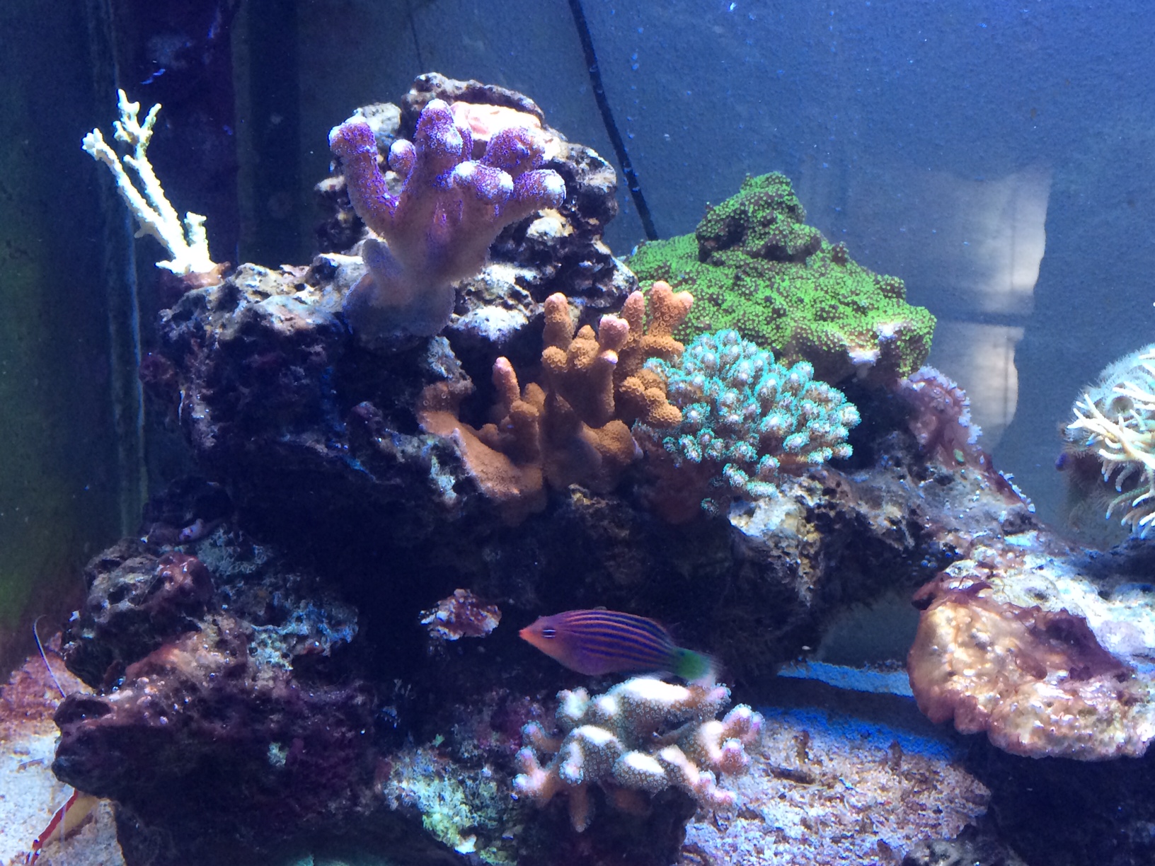 Vielleicht solltest Du mehr Fische einsetzten? Sollten keine grossen sein sondern zB ein Schwarm welcher auch in die Korallen sich zurückzieht.