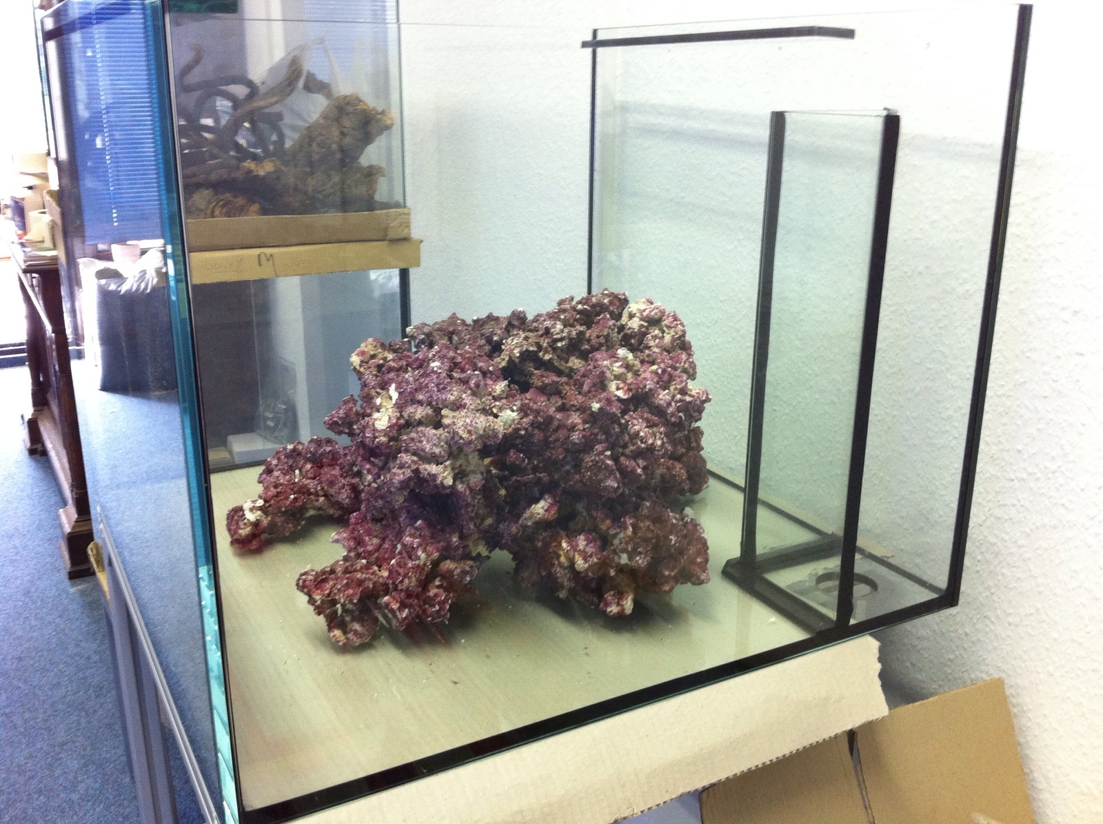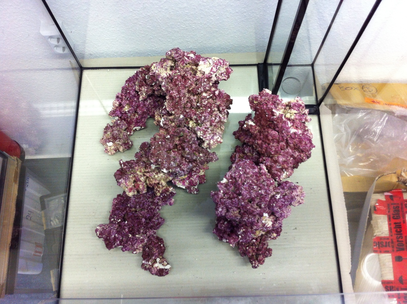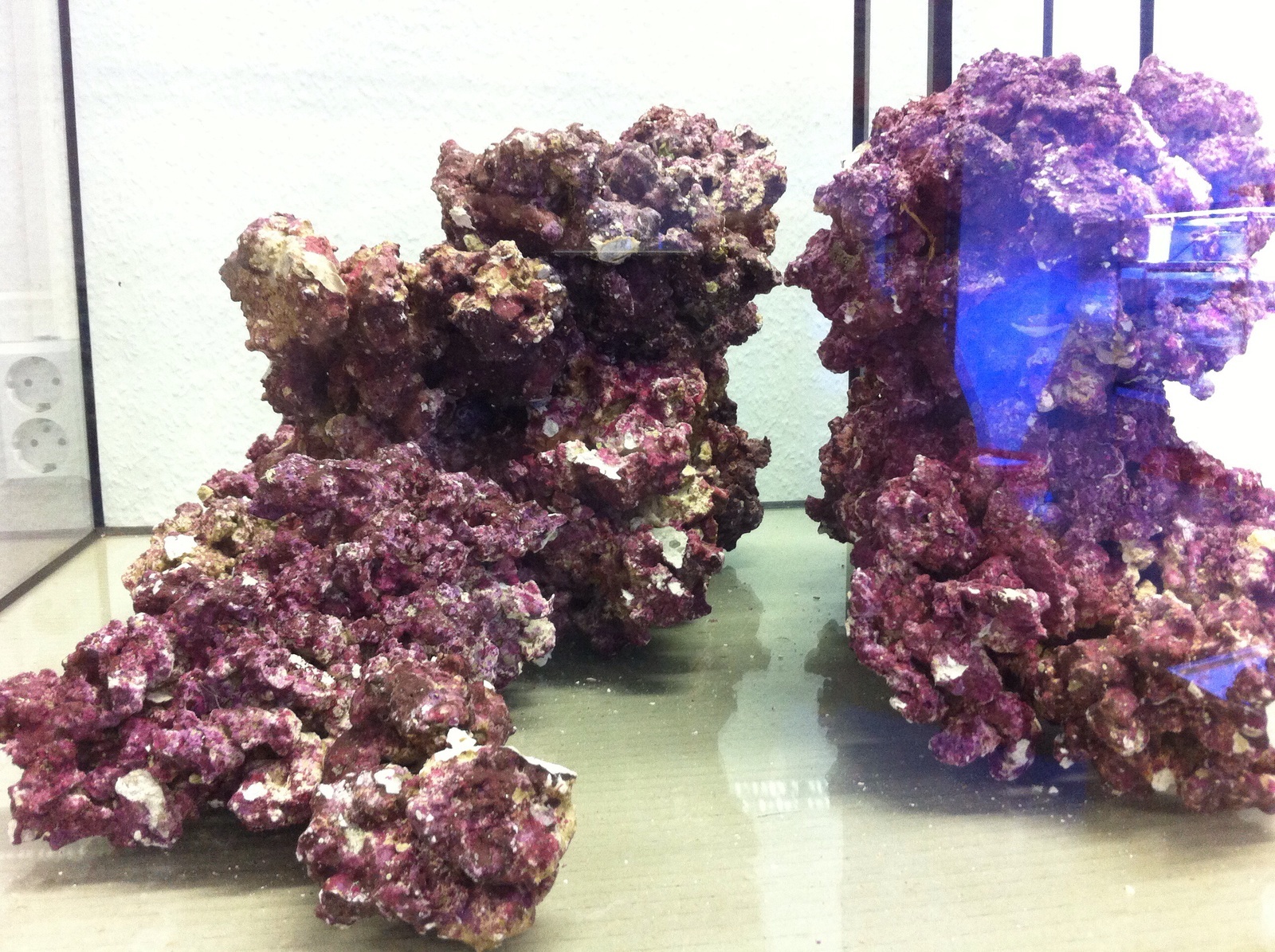 Die beiden Plateaus sind gleich hoch. Oben und v.a. im hinteren Bereich des linken Plateaus werden Acroporas platziert, einige astförmige wie A. horrida, A. florida und auch 1-2 Acropora millepora. Ansonsten werden in den flacheren Bereichen an den Seiten nur krustenförmige Korallen platziert, damit ich keine Probleme beim Scheibenreinigen bekomme und das Riff nicht nach außen wächst. Einige Acans, ggf. auch Zoanthus, mal schauen.