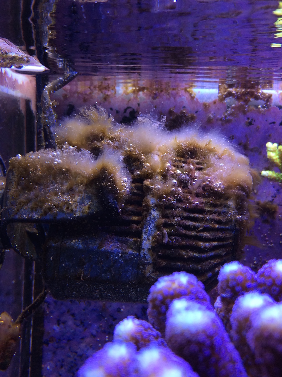 Derbesia könnte sein, sieht aber bei mir alles etwas bräunlicher aus. Hier habe ich noch mal eine Nahaufnahme von der Pumpe, die ca. 2 Wochen nach Reinigung wieder so aussieht... Silikat habe ich auch erst getestet, ist im Becken <0,01... Bis auf den Neuzugang habe ich ja keine Verluste, deshalb will ich es erstmal mit kleineren Stellschrauben versuchen