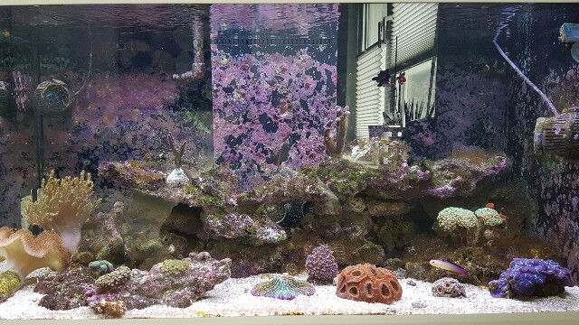 Ich muss wegen des Besatzes dazu sagen, das die Korallen aufgrund von einer Dinoplage mit div. Begleiterscheinungen vor ein paar Monaten dezimiert wurden (alle sps) und das derzeitige layout nur vorübergehend ist. Aufgrund von Algen und Glasrosen ist das obere Riff kaum bewohnbar. ich wollte vor allem wieder Verbraucher rein bringen.