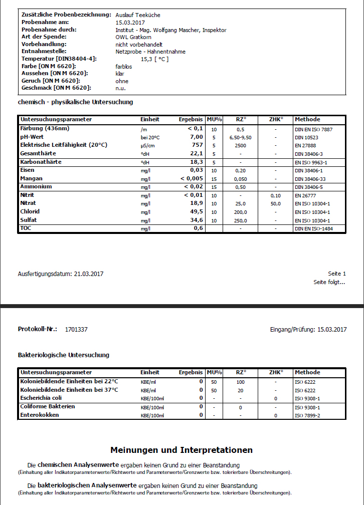 Mir ist eingefallen, dass wir erst vor kurzem eine Prüfung unserer Wasserwerte des Leitungswassers durch das Hygieneinstitut der ansässigen Uni hatten.
