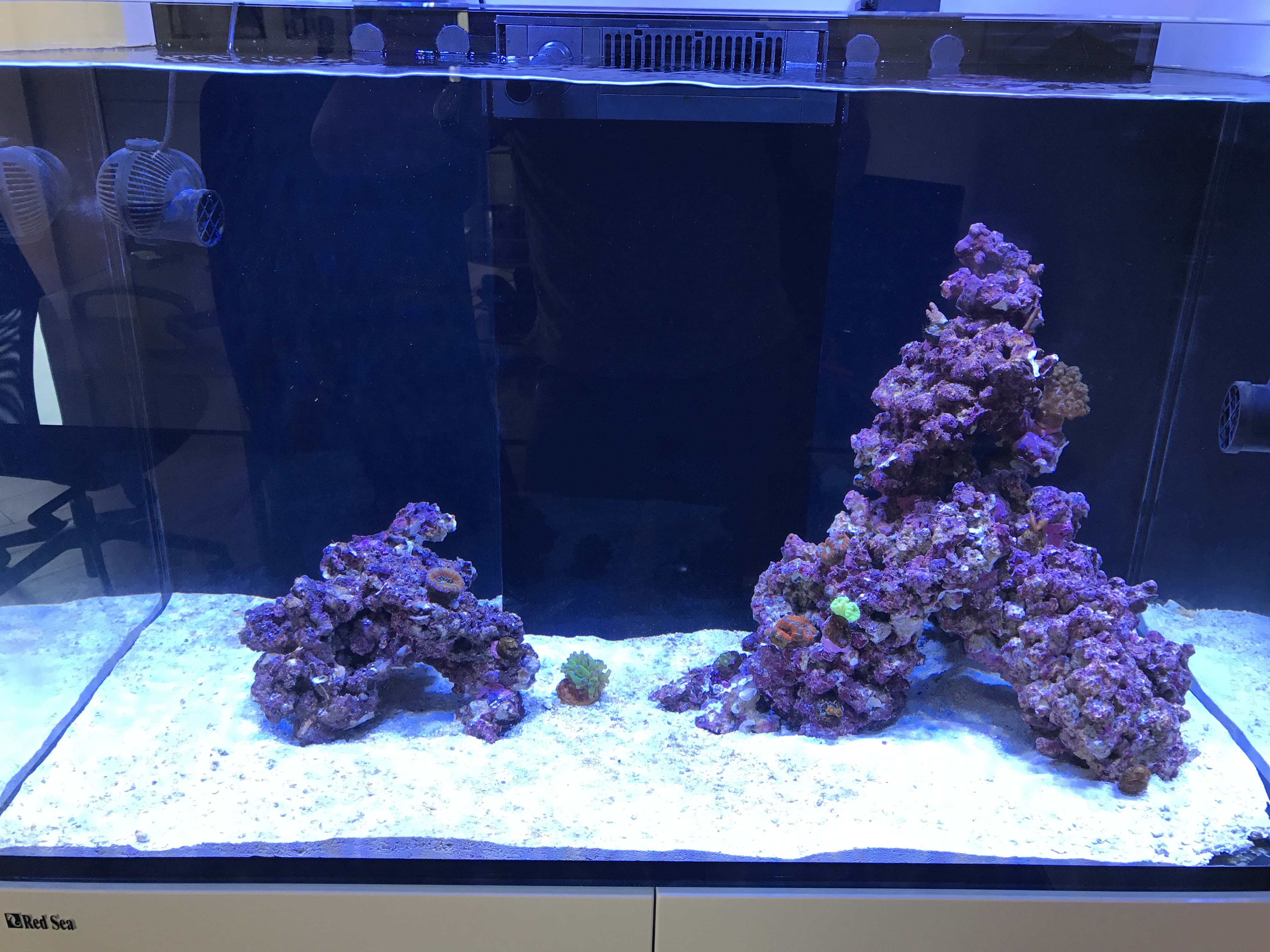 So, die Kieselalgen sind weniger geworden und etwas grüne Algen sind dazu gekommen, auch an den Scheiben. Die Krustenanemonen sind mittlerweile wieder schön offen.
