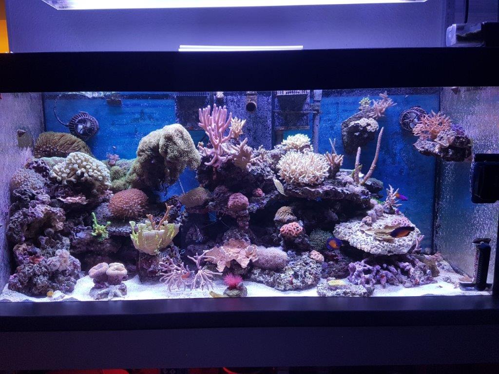 Zu diesem Zeitpunkt war das Becken noch sehr blaulastig, ich habe mich aber die letzten Tage intensiv mit dem Thema beschäftigt und die Lampeneinstellungen nach Sangokai-Vorgaben angepasst.