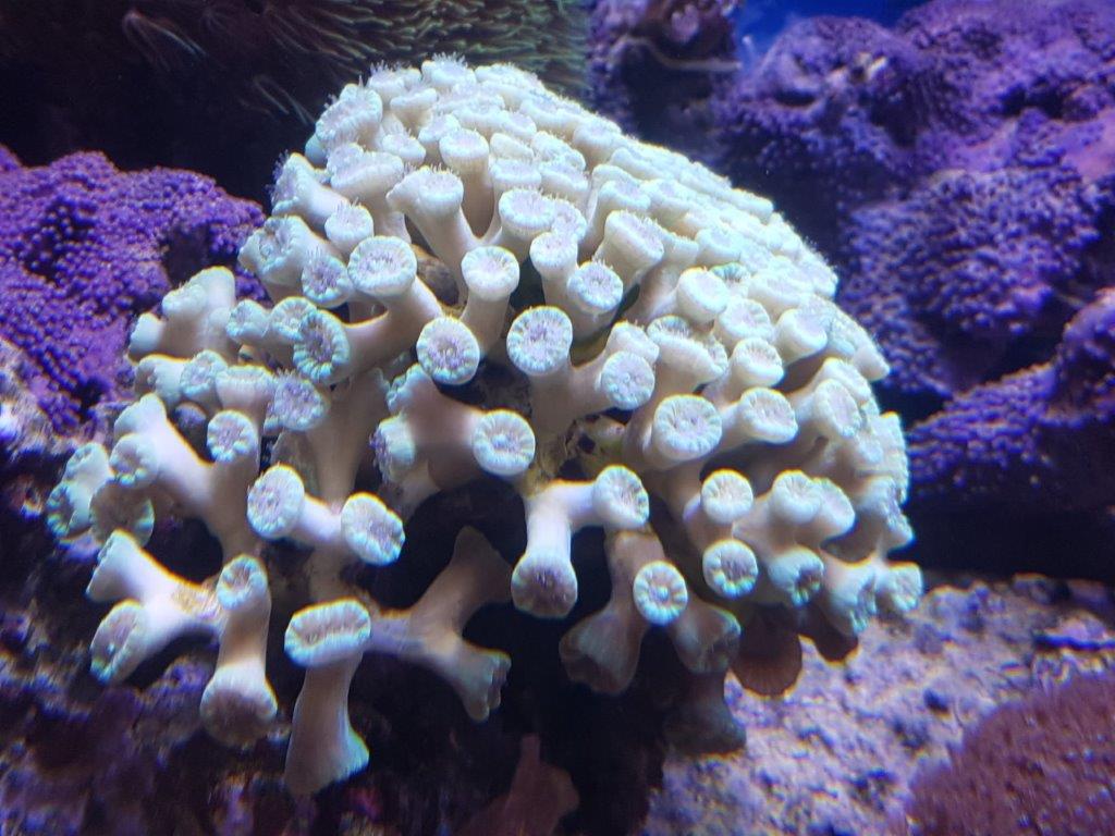 Die Monti-Platten haben inzwischen sehr stark ausgeprägte Wachstumsspitzen und sind nicht mehr so blaß. Auch Bartkoralle und Goniopora sind im Gegensatz zu vorher jetzt ständig voll offen. Letztere ist leider in einem einheitlichen Graubraun, es wird wohl noch einige Zeit dauern bis sie ihre ursprüngliche Farbe wieder bekommt.