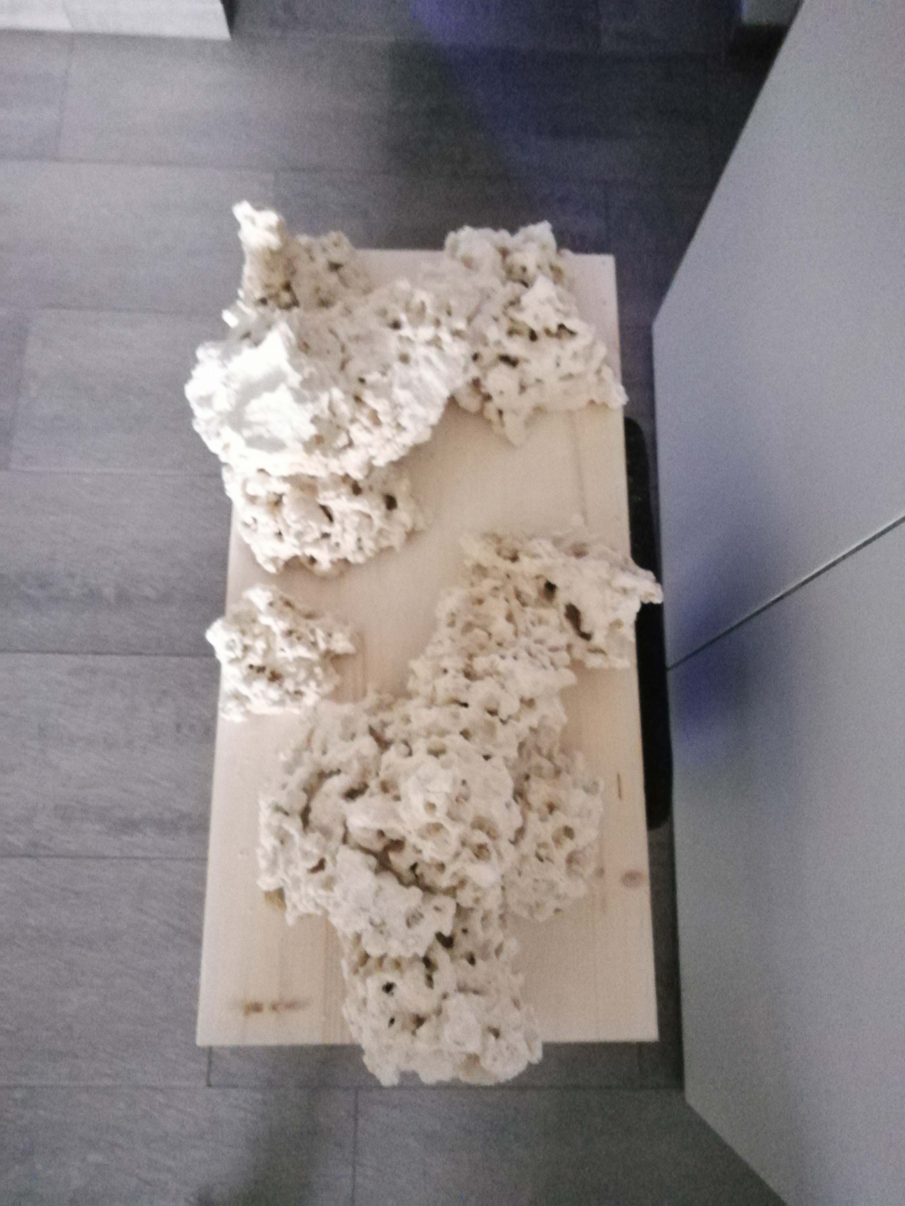 da das Becken noch auf sich warten lässt, habe ich mich schon einmal an den Aufbau gemacht. Die Platte ist 60 x 80 cm und die höchste Stelle vom Aufbau ist 23 cm hoch. Da das Becken 110 x 60 x 60 wird, sollte auf allen Seiten 10 cm Platz zum Putzen bleiben.