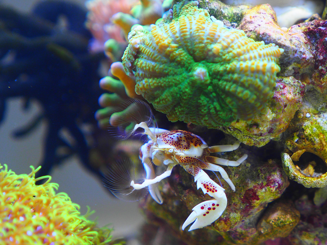 Eine Boxerkrabbe, eine Blaukörperscherengarnele, ein Porzellankrebs, mehrere selbstgezüchtete Felsengarnelen (Palaemon elegans), diverse Einsiedler, Schnecken. Ist der alte Besatz aus meinem 50-Liter-Riffchen gewesen.