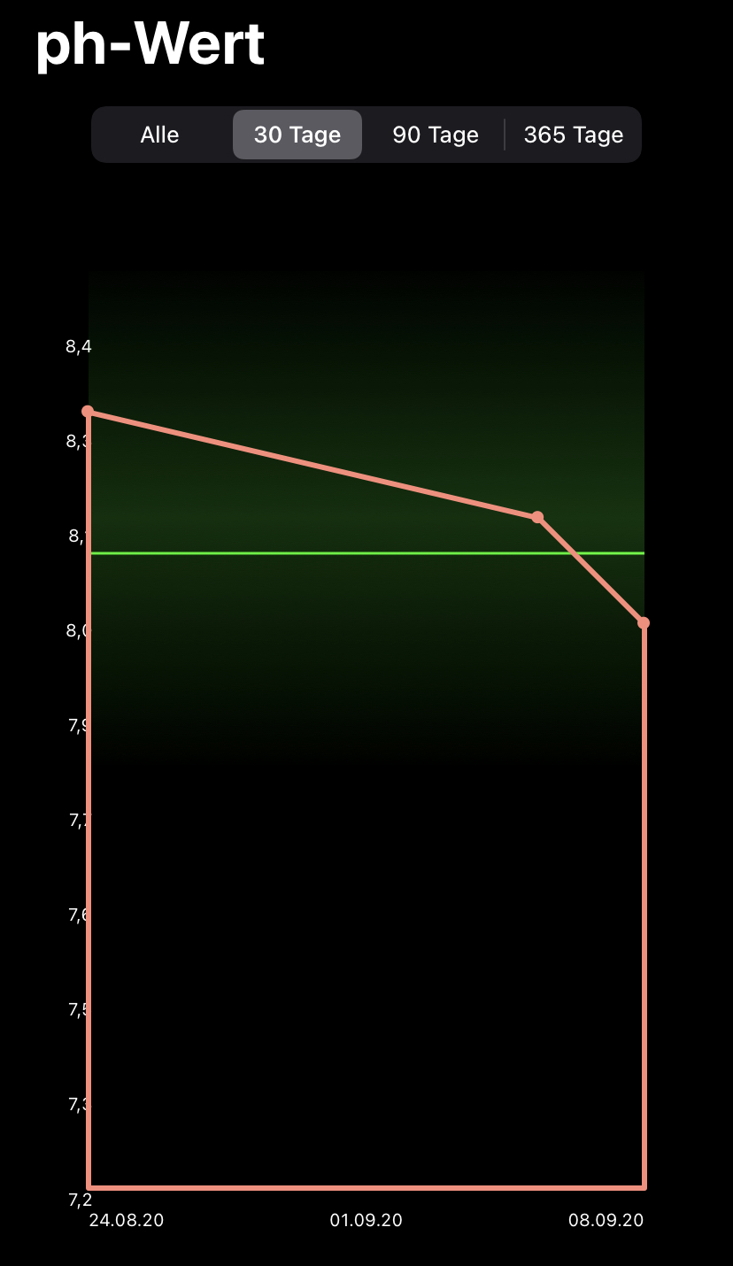 Dieter, das ist nicht penetrant. Ich bin wirklich dankbar. Anbei meine Statistik des PHs in 3 Bildern mit jeweiligen Zeitstrahlen. Wie man sieht ist er in den letzten Tagen gefallen. Grund waren die Vorbereitungen auf das SagoKai Basic. Hier soll ja der PH eher bei 7.5 und nicht über 8.0 sein.