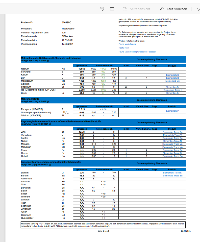 Bor, Strontium und Brom stehen hier und sind ausgeglichen muss jetzt mal die nächste ICP gucken wie weit die Werte fallen glaube nämlich das mein Salz einfach zu wenig hat. Hab das Red Sea Sea Salt (Blauer Eimer)