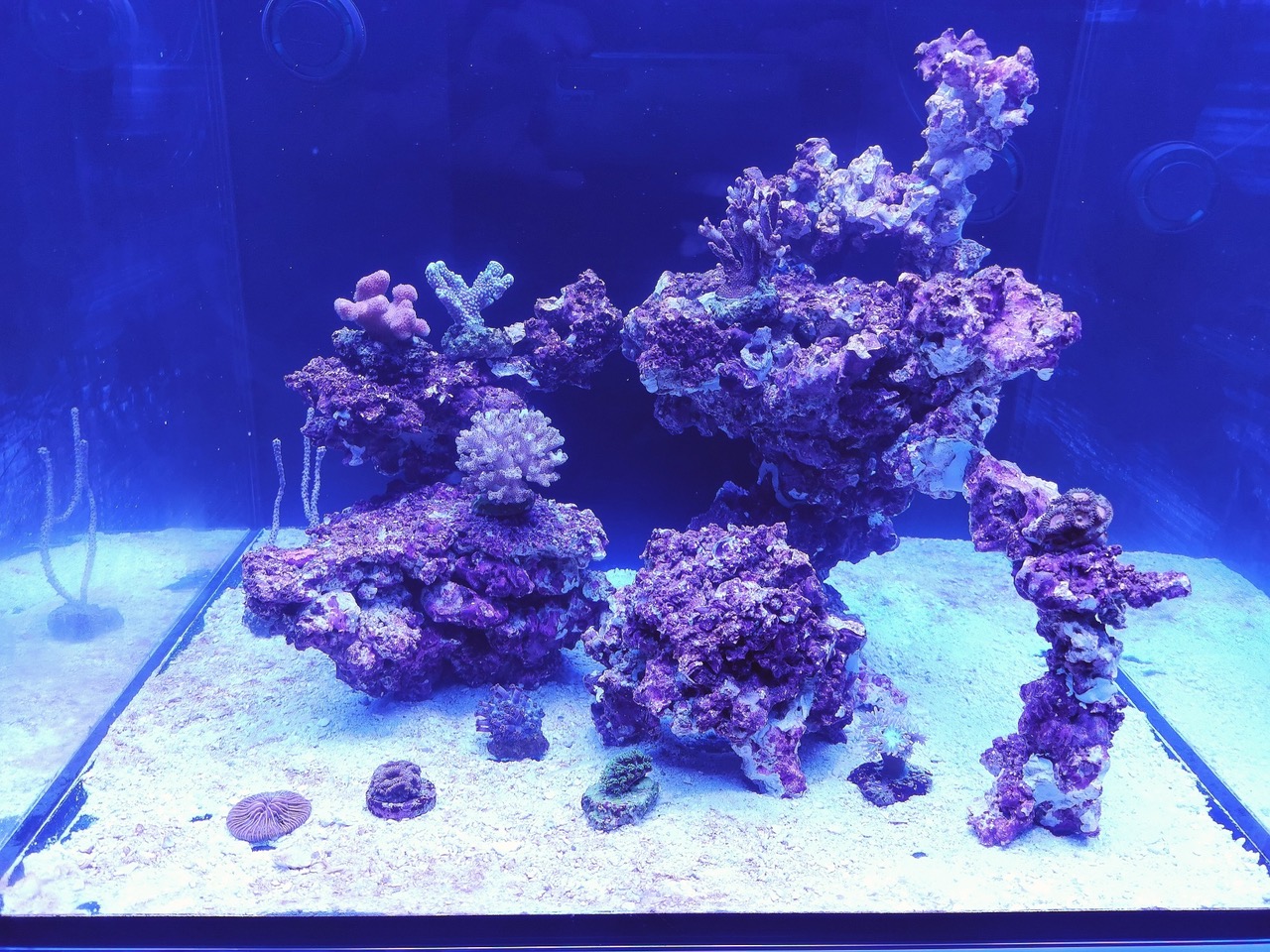 Bodengrund / Algen: Wir hatten eine ganz kurze Phase in der auf dem Sand rot-braune Algen gewachsen sind (ganz wenig auf dem Gestein). Der Sand ist noch davon durchsetzt, oben drauf sehen sie eher verkümmert aus. Wir stehen derzeit vor der Überlegung, ob wir den gesamten Bodengrund entfernen oder ob wir den Sand durcharbeiten und versuchen die Verunreinigungen zu entfernen.