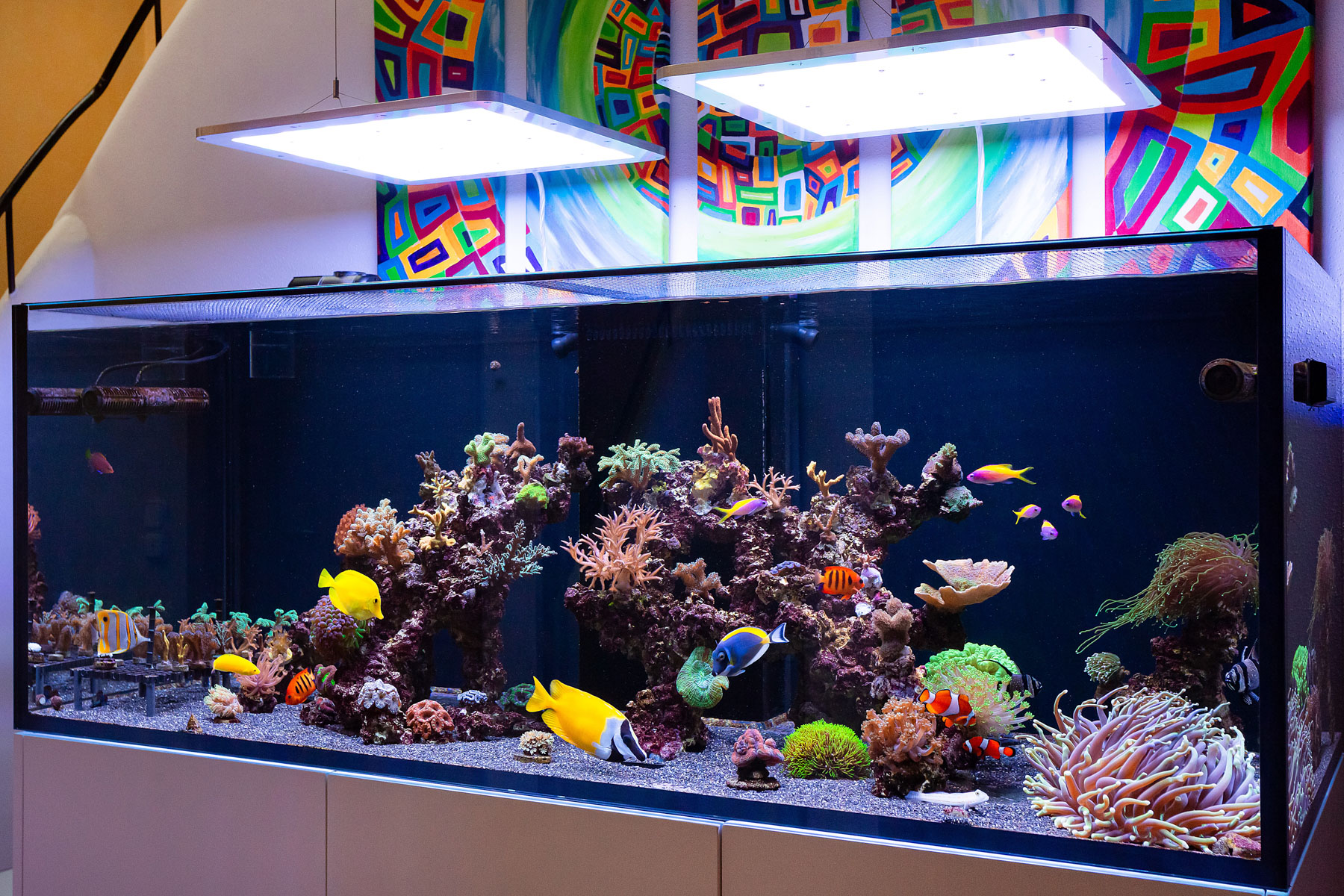 Ursprünglich wollte ich weder schwarzen Hintergrund noch dunklen Bodengrund... aber jetzt mit den vielen bunten LPS Korallen und der etwas blaulastigeren Beleuchtung poppt der Kontrast m.M. nach schon recht gut.