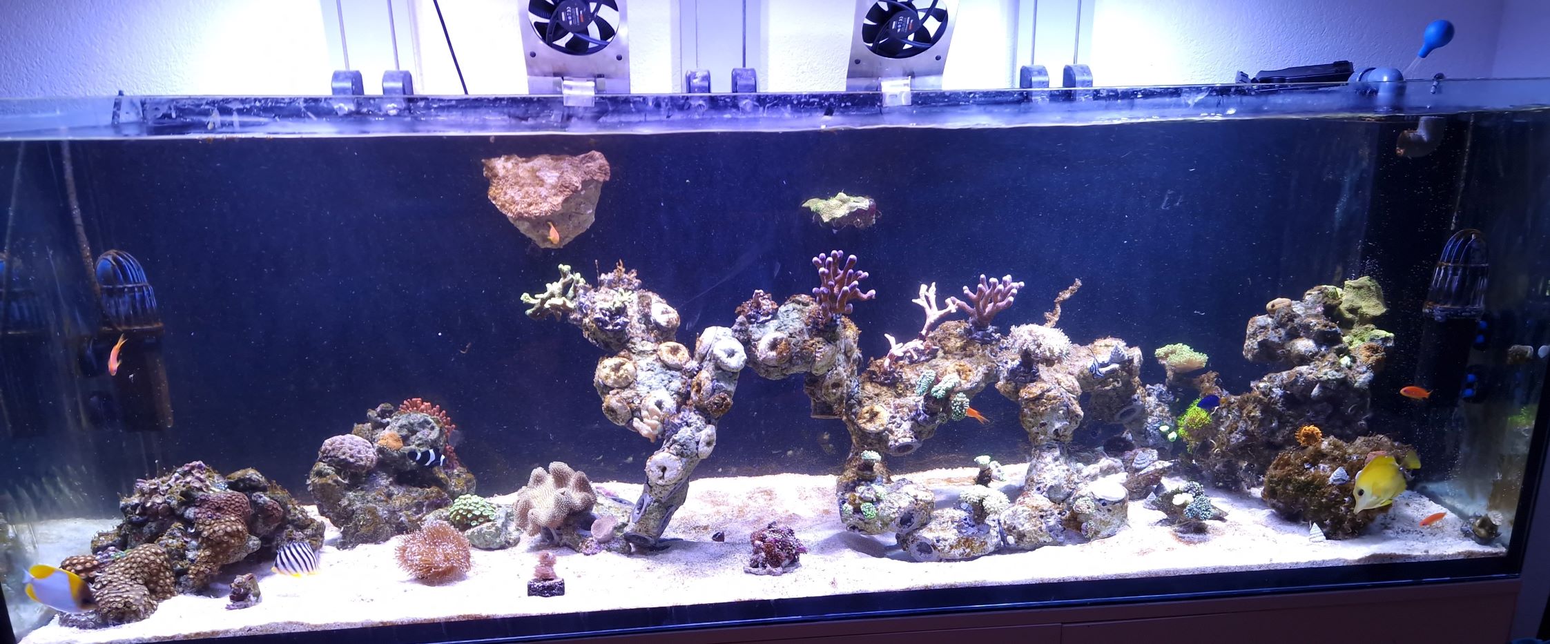 700 Liter Becken (siehe Foto) . Becken ist drei Monate alt . Habe leider mit einer falschen Lichteinstellung angefangen . Viel Zuviel UV und UV Violette also kurzwelliges Licht . Ist jetzt weg . Fahre im moment die schwächere der 2 Varianten . Habe im moment auch Dinoflagellaten, werden zum Glück schon wieder weniger . Sauge auch ab . Vielen Dank für eure Hilfe.