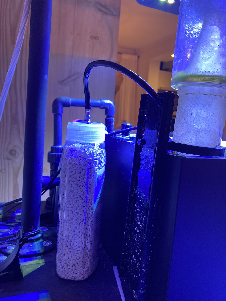 Mal aber zum ph-Wert. Da vor allem im Winter das Problem mit erhöhten CO2 Werten in der Wohnung einige zu kämpfen haben, so auch ich. Beschloss ich Atemkalk einzusetzen…da ich aber einen Holzausströmer mit einer Luftpumpe verwende, kann ich keinen klassischen Atemkalkfilter nehmen…also kurz überlegt, zwei kleine 6 mm Schlauchanschlüsse (Kart-Zubehör) gekauft und ne leere 500 ml Kunststoffdose genommen.