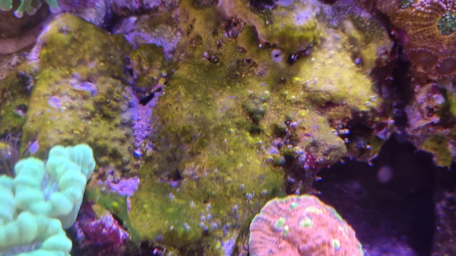 An zwei Stellen haben sich grüne Algenbeläge breit gemacht, die man sehr leicht absaugen kann und die gerade abends photosynthetisch sehr aktiv sind, ich vermute es sind grüne Cyanos. Bisher habe ich noch kein Rezept gegen sie gefunden ausser Absaugen, aber binnen einer Woche ist der Stein wieder voll. Das gute ist, sie überwachsen keine Steinkorallen, daher bin ich da noch ganz entspannt. Eine Schneckenart frisst sie auch, aber eher widerwillig.
