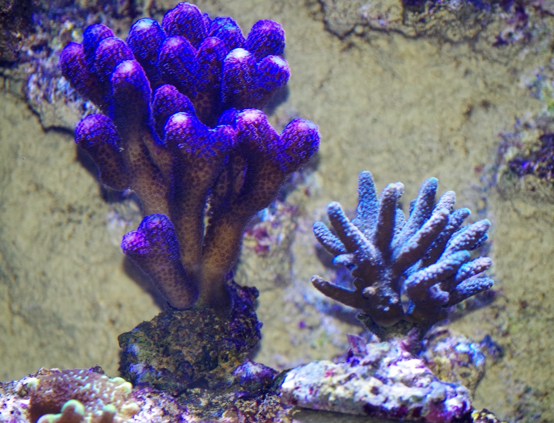 stelle euch ein paar Bilder hier rein. Die Cyanos sind mehrheitlich auf dem Sand. Ich hoffe, dass auch das Polypenbild meiner Korallen deutlich wird. Nach meiner Ansicht habe ich es hier mit einer Pest zu tun, die unter Klarwasser gut wächst. Wenn Ihr Empfehlungen habt, wie ich vorgehen soll, bin ich Euch schon jetzt dankbar.