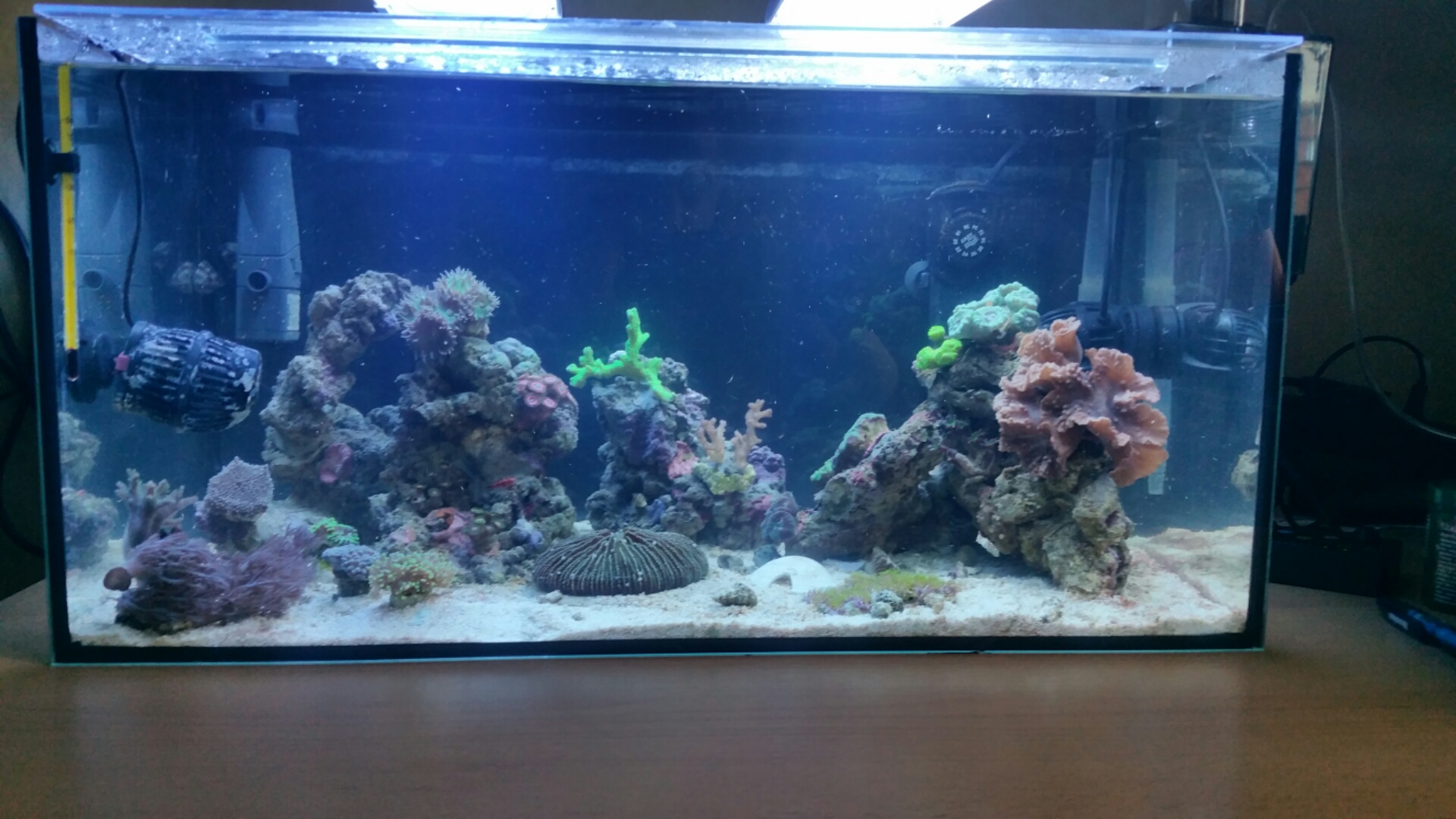 Sooo.. Ich hab angefangen schrittweise den Sand abzusaugen, um in zukunft die Steine neu anzuordnen, weil das mit der Strömung hinten und vorne nicht klappt. In den Ecken lasse ich was liegen, damit die nassarius sich noch einbuddeln können.