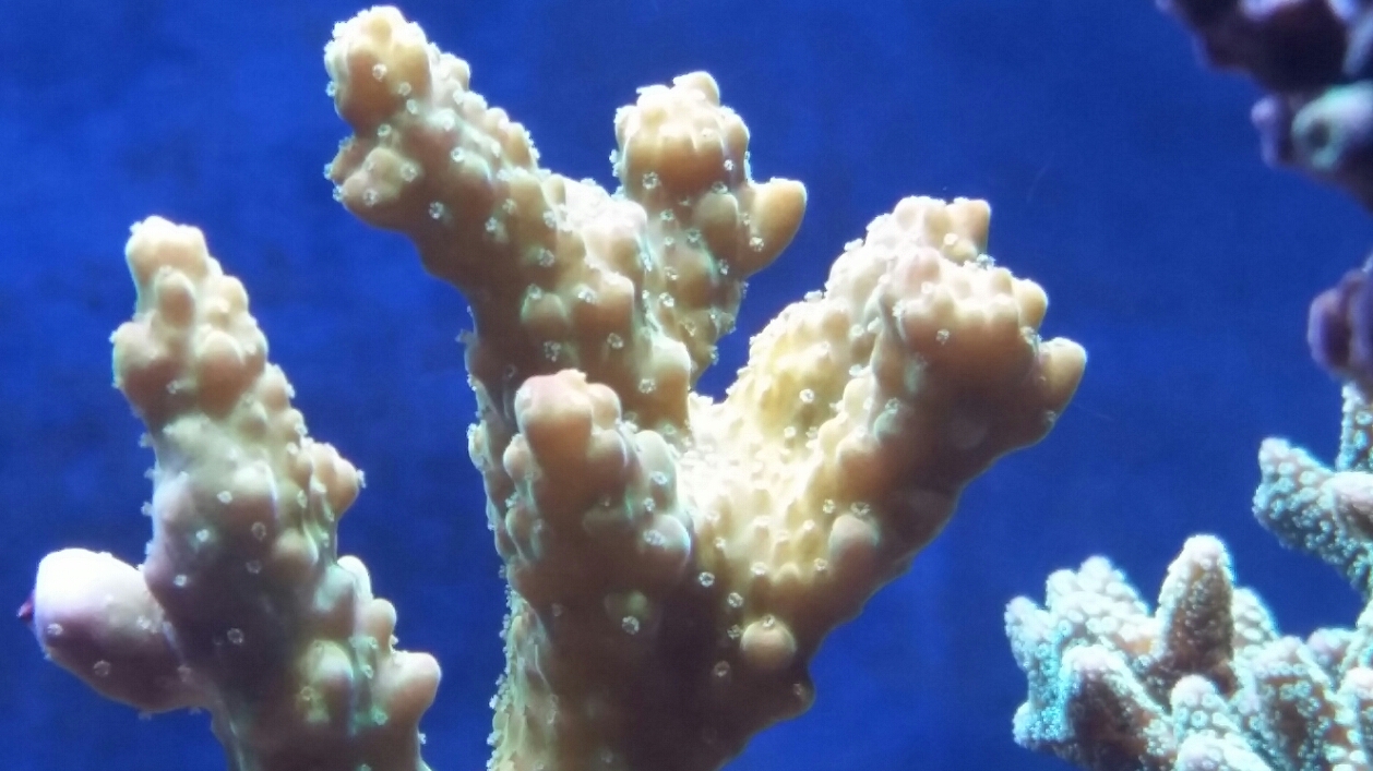 Montipora digitata auch, allerdings bei meinen hellen mit blauen und weißen Polypen, wird der Körper dunkler.