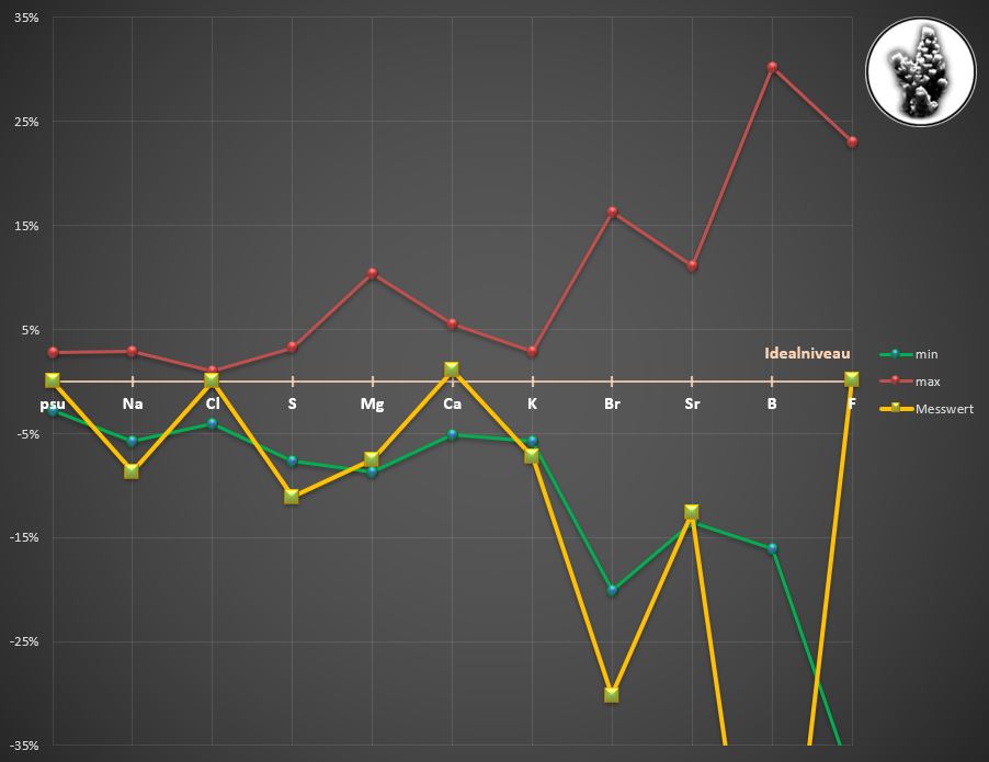 Bzgl. den gemessenen Hauptelementkonzentrationen passt einiges nicht. siehe Bild. In Relation zu den 36,3 Salinität (falls dieser stimmt) sind etliche Werte zu niedrig. Besonders Bor.