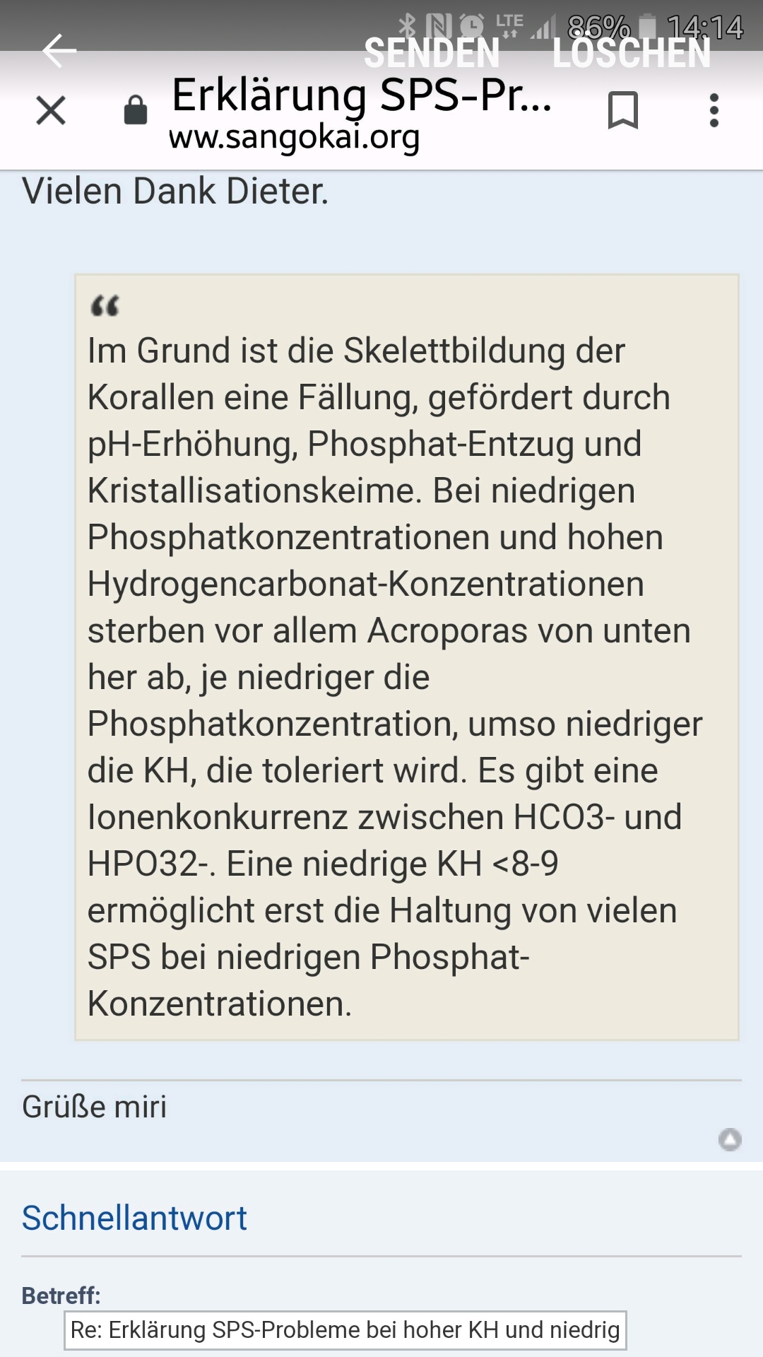 [/quote]Durch die Nitratzufuhr unter niedrigen Phosphatkonzentationen steigt anfänglich die Dichte der Zooxanthellen in der Koralle (d.h. die Korallen werden dunkler/brauner) bis die Korallen letztendlich aufgrund von Sauerstoffradikalenproduktion mit Absterben/Ausbleichen des Korallengewebes reagieren. Hohe Nitratwerte und geringe Phosphatkonzentrationen sollten vermieden werden!![/quote]